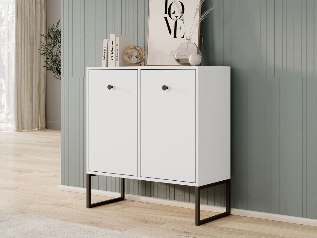 Fehér színű LINEA 2D kétajtós komód, amely egy igazán mutatós és minőségi bútordarab. Elegáns designja és modern kialakítása mindenkit levesz a lábáról. A komód ajtajai mögött polcok találhatók.
