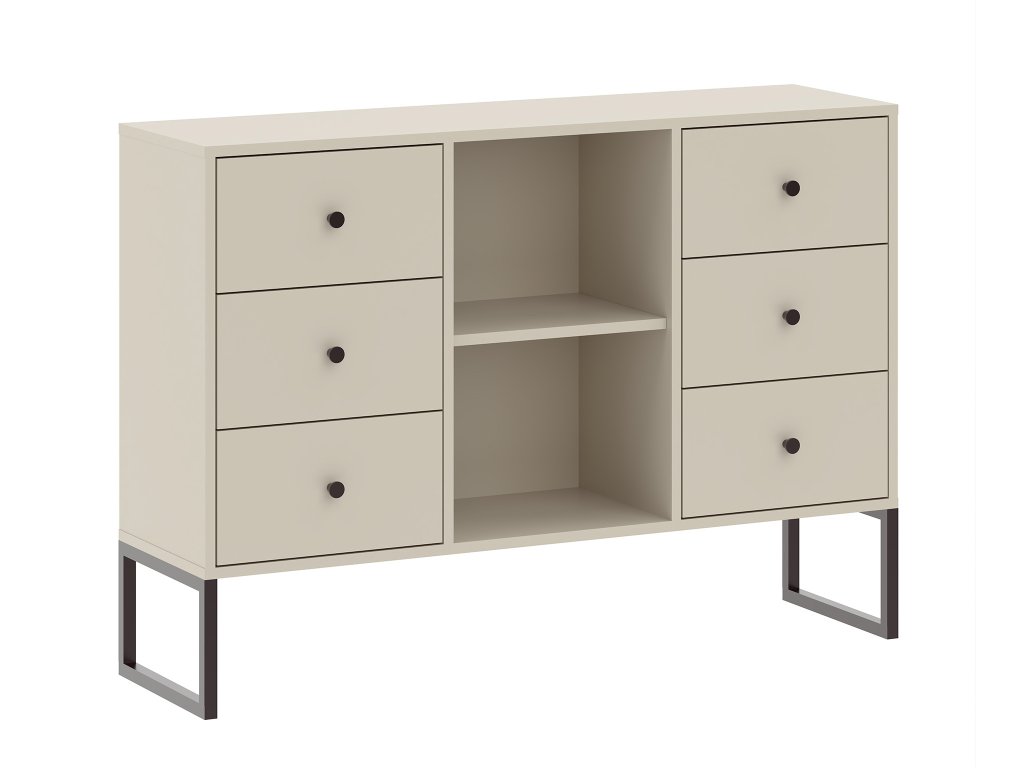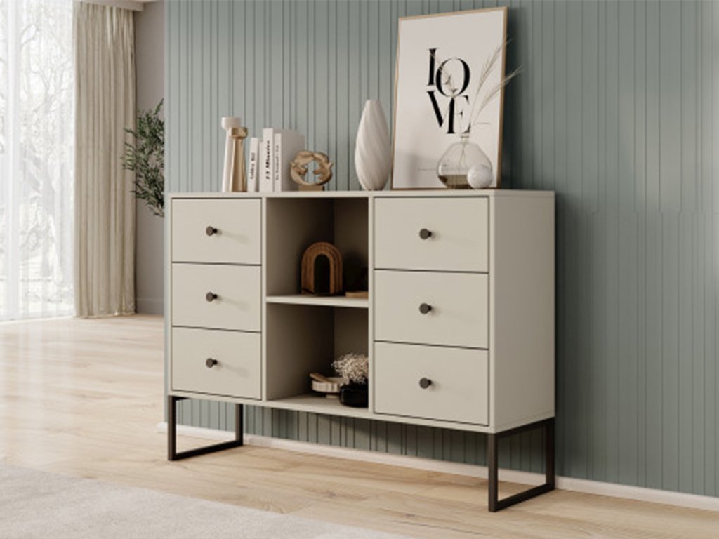 - LINEA 6S komód: hatfiókos elegáns komód, amely a közepén nyitott pocokkal rendelkezik ponúka
