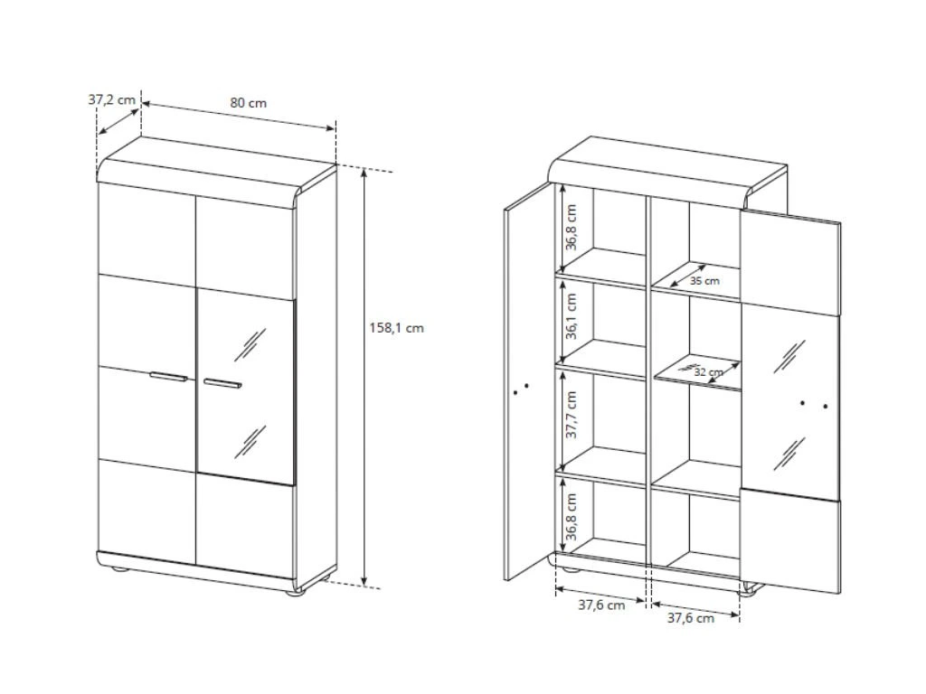 LINK alacsony kétajtós vitrines szekrény, amely hat polccal rendelkezik, melyek közül egy üveg polc. Az üveges szekrény ajtajai univerzálisak, jobbosan és balosan is fel lehet szerelni őket. A LED világítás nem a vitrin része.