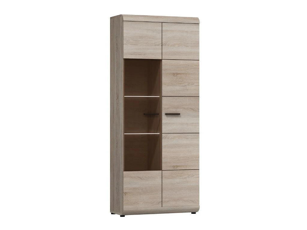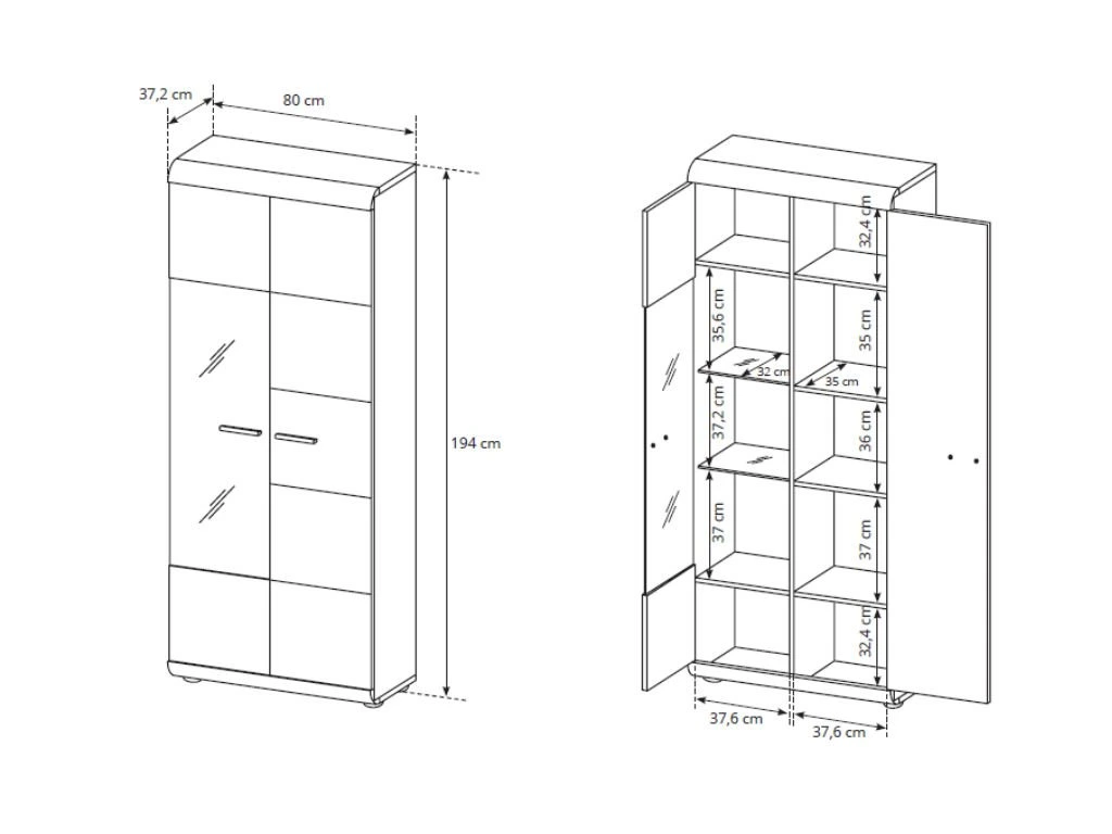 A LINK magas kétajtós vitrin összesen nyolc polccal rendelkezik, amelyek közül kettő üveges. A vitrin univerzális, az ajtókat jobbosan vagy balosan is fel lehet szerelni. A LED világítás nem a szekrény része.