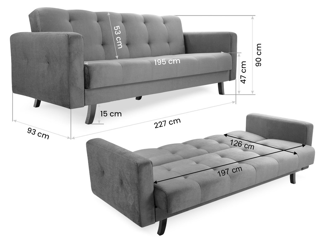 Az ülőfelületet és a háttámlát díszítő gyönyörű steppelés igazán luxusos kinézetet kölcsönöz a kanapénak. A fekete fa lábak stílusosak, ezen felül garantálják a kanapéágy stabilitását. A Lisszabon kanapé rendkívül praktikus is. A szétnyitható funkciójának köszönhetően ággyá alakítható, amely jó szolgálatot tesz a vendégek érkezésekor. Az ülés alatt egy tároló rekesz található, ahová elteheti az ágyneműt vagy az egyéb apróságokat. A váza tömör fából és bútorlapból készült. Az ülőfelület és a háttámla Bonell rugókból és magas rugalmasságú T30-as habból készült. Jutalmazza meg magát ezzel a modern Lisszabon kanapéval és tegye még szebbé a nappaliját.