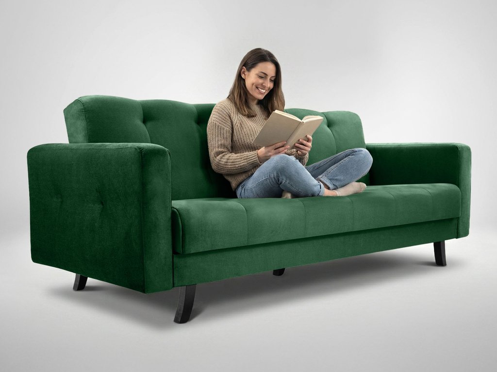 Ez a modell ideális egyének, párok és családok számára, akik kényelmes ülőhelyet keresnek alkalmi alvási lehetőséggel. A háromszemélyes kialakításnak és a kihúzható funkciónak köszönhetően kisebb és nagyobb helyiségekbe egyaránt jól illik. A zöld szín friss és pozitív hangulatot teremt, energiát és stílust adva a belső térnek.