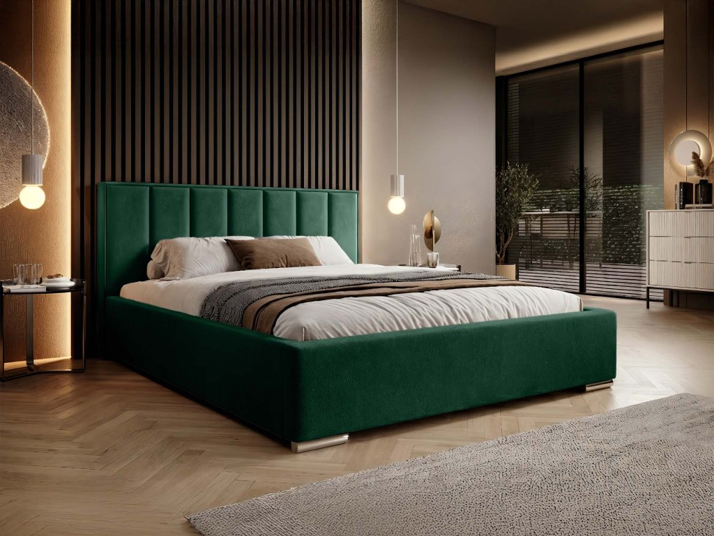 Elegáns zöld színváltozatban készült LOIS ágyneműtartós franciaágy 140x200, amely garantálja majd a mindennapi kényelmét. Az ágy bársonyos Velluto szövettel kárpitozott, amely finom fényes felületével és puha tapintásával eleganciát kölcsönöz az ágynak, miközben ellenálló képességéről és könnyű tisztíthatóságáról is ismert. A puha kárpitozott ágytámla függőlegesen steppelt panelekkel díszített, amely elegáns megjelenést kölcsönöz az ágynak. A zöld kárpitozás finomságot és modern eleganciát visz a hálószobába. Az ágy minden részlete precízen kidolgozott. Minőségi laminált bútorlapból és tömör fából készült stabil szerkezete hosszú élettartamot és szilárdságot garantál, amit a mindennapi használat során is értékelni fog.