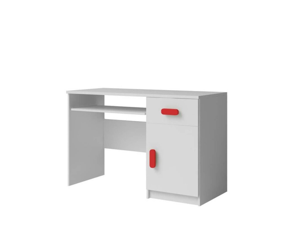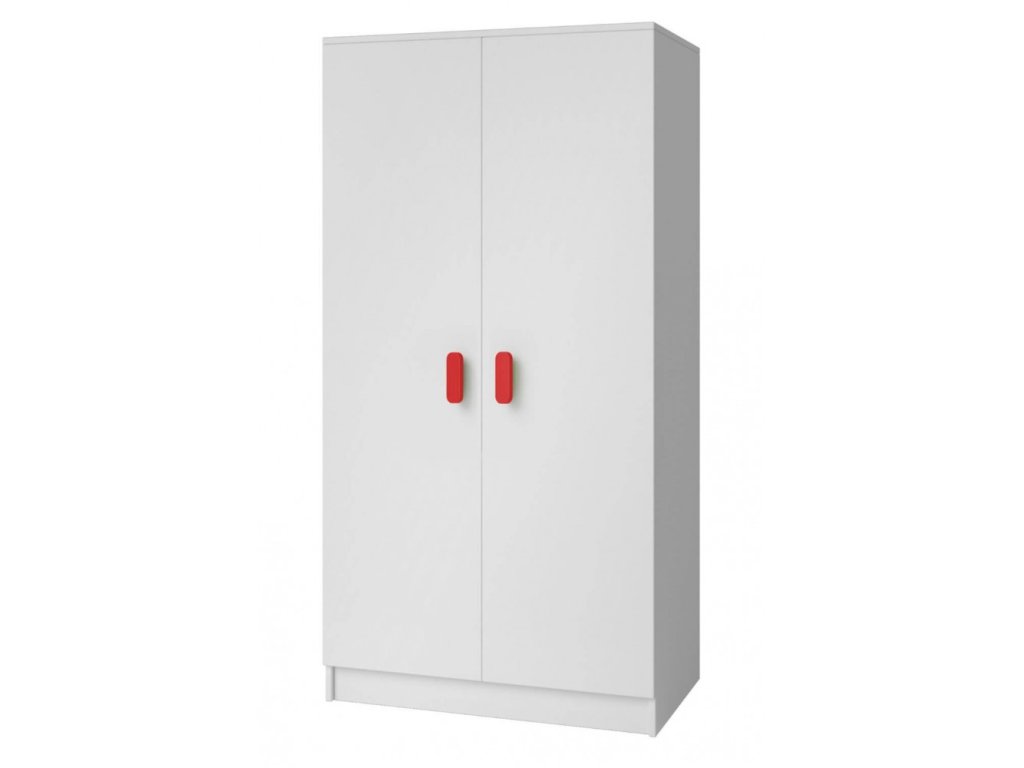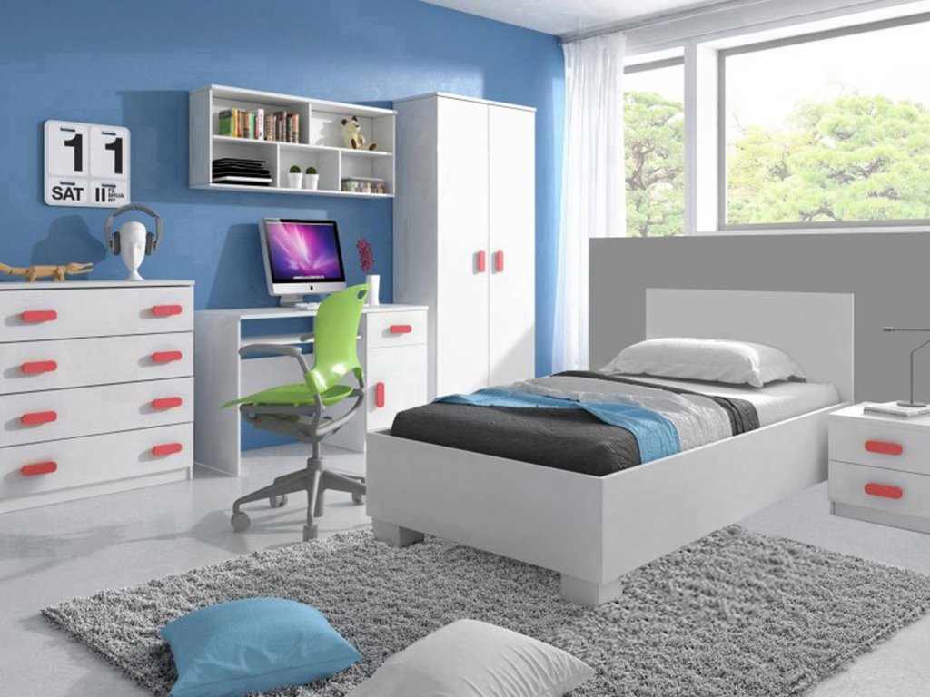 Gyerekszoba egyszerű dizájnnal, piros fogantyúkkal.Ez az összeállítás 16 mm vastag laminált deszkákból készül. A polc nem része az ágynak, de hozzávásárolható. Az ágyrács része az ágynak. Az ágy matrac nélkül kapható.