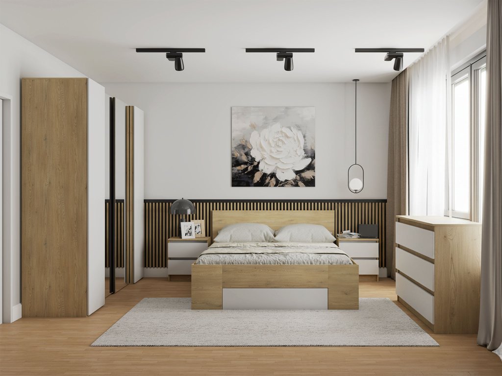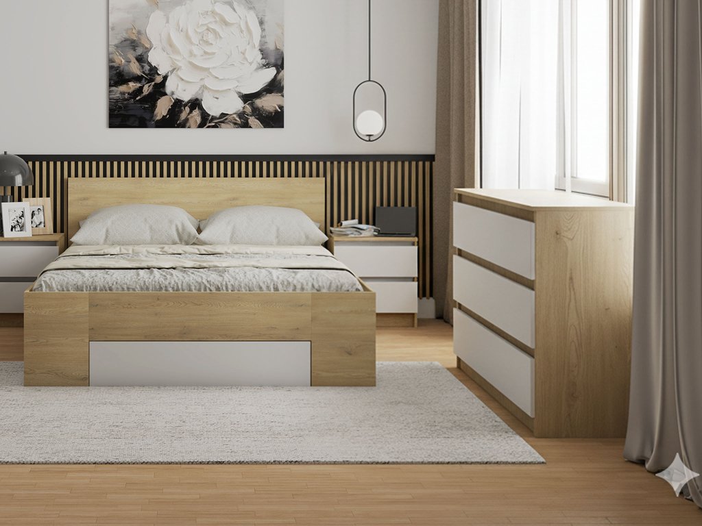 A LORIS hálószoba bútor garnitúra ideális megoldást jelent minden modern otthonba, ahol a stílus és a praktikum harmóniája találkozik. A designos Loris bútorcsalád cremona tölgy és magasfényű fehér szín kombinációjában készül. Ez az elegáns kombináció igazán pompás összhatást alkot. A Loris a minőség garanciája. Minden egyes bútordarab minőségi laminált 16 mm vastag forgácslapból készült ABS élzárással. Ennek köszönhetően az egyes bútordarabok ellenállóak a nedvességgel és a karcolásokkal szemben. A kollekció tartalmaz minden alapvető bútordarabot, amelyre csak egy hálószobában szüksége lehet: tágas gardróbszekrényt, franciaágyat praktikus ágyneműtartóval, fiókos komódot valamint éjjeliszekrényt is. A fiókok csendes és kényelmes használatát a görgős fióksínek biztosítják. A LORIS kollekcióval olyan hálószobát hozhat létre, amely nemcsak szép, de maximálisan kényelmet is garantál.