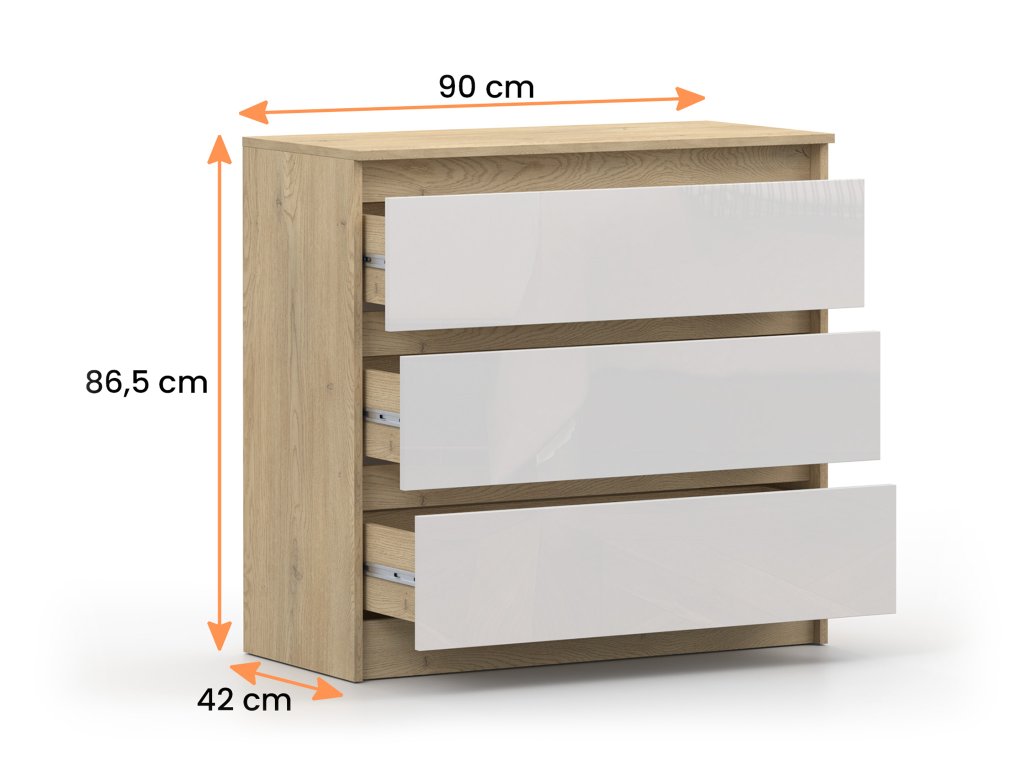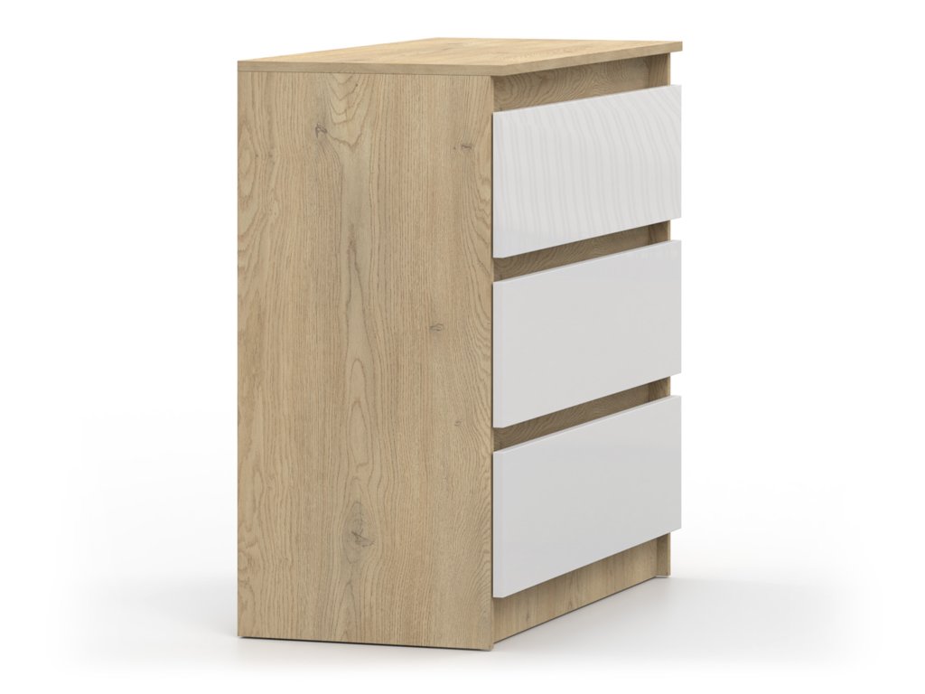 A LORIS háromfiókos komód úgy lett megtervezve, hogy a lehető legjobban kihasználja a rendelkezésre álló helyet a hálószobában vagy az előszobában. Egyszerű, letisztult formája miatt többféle stílushoz is megfelelő lehet. A bútortest meleg hatású cremona tölgy színben készült, míg a három fiók magasfényű fehér. Ezek ideálisak a ruhák, fehérneműk vagy kisebb tárgyak tárolására, így segítenek fenntartani a rendet a szobában. A komód elegáns és praktikus darab, amely tökéletes a LORIS bútorcsaládba tartozó ágyhoz vagy gardróbszekrényhez is.