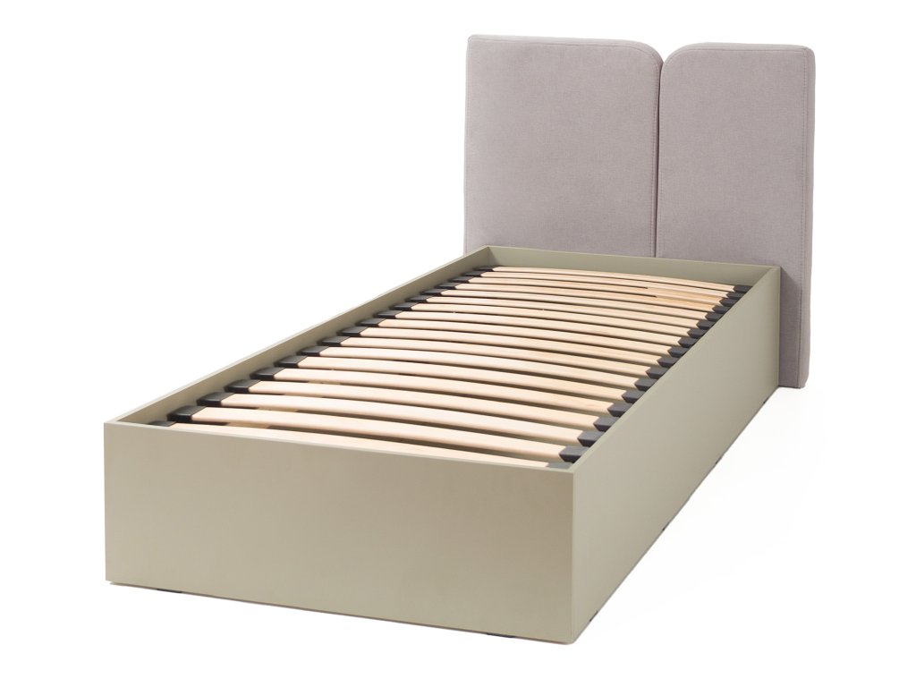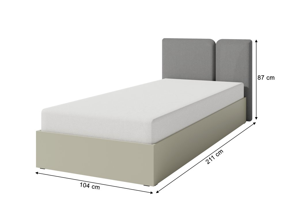A kárpitozott egyszemélyes ágy gázrugós nyitással rendelkező tágas ágyneműtartóval is rendelkezik. A szürke háttámlát jobbosan vagy balosan is össze lehet szerelni. Minőségi 16 mm vastag laminált forgácslapból készült, az élei pedig ABS élzárással rendelkeznek.