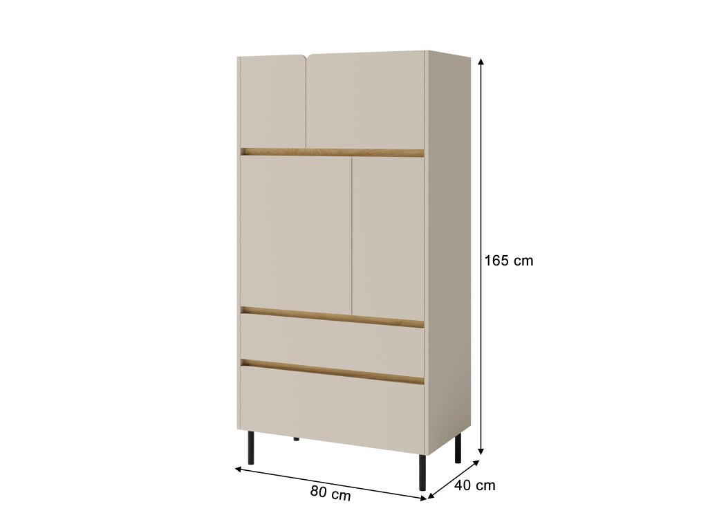 Ez a modern magas LUCA komód 165 centiméteres magassággal és magas fekete fém lábakkal rendelkezik. Az olajozott tölgy színű elemek kombinációja a homokszínnel igazán elegáns és lágy hatást keltenek. Ezekkel a semleges színekkel az ember sosem lőhet mellé. A komód az aljában két nagy fiókkal rendelkezik, amelyek fölött négy kis szekrény található polcokkal. A magas komód minőségi laminált 16 mm vastag forgácslapból készül. Az élei ellenálló ABS furnérral biztosítottak. Az ajtók fogantyú nélküli nyitással rendelkeznek.