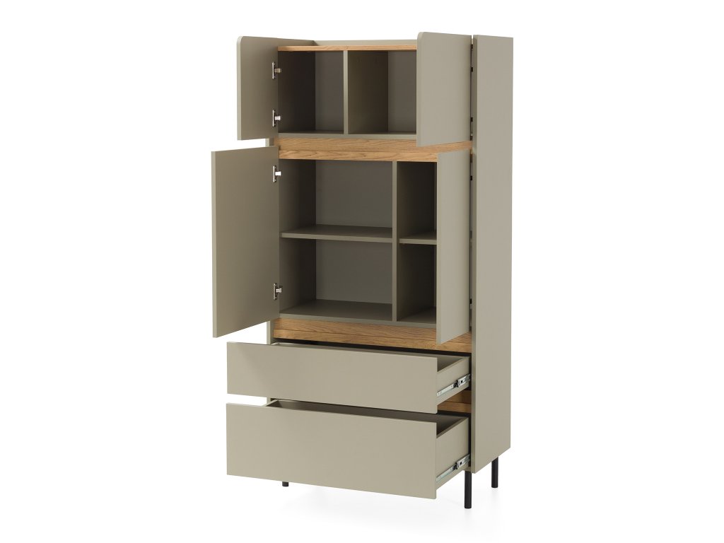 Ez a modern magas LUCA komód 165 centiméteres magassággal és magas fekete fém lábakkal rendelkezik. Az eukaliptusz tölgy és a baltic tölgy színű elemek kombinációja igazán elegáns és lágy hatást keltenek. Ezekkel a színek igazán jól kombinálhatók. A komód az aljában két nagy fiókkal rendelkezik, amelyek fölött négy kis szekrény található polcokkal. A magas komód minőségi laminált 16 mm vastag forgácslapból készül. Az élei ellenálló ABS furnérral biztosítottak. Az ajtók fogantyú nélküli nyitással rendelkeznek.