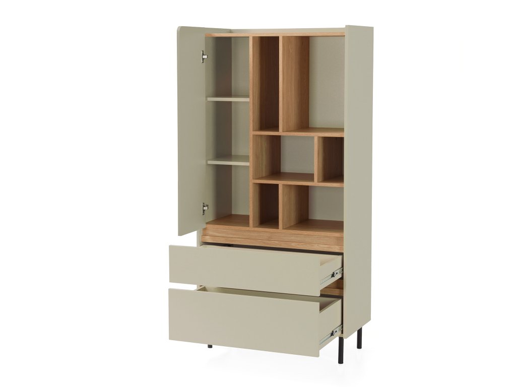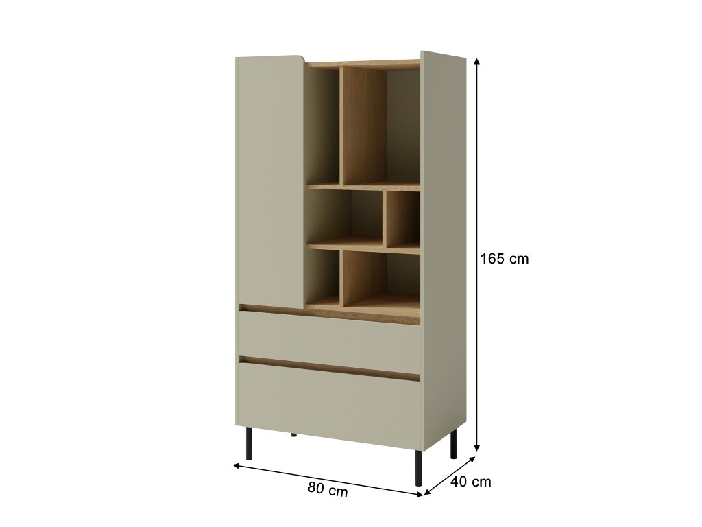 A LUCA magas polcos komód egy elegáns kiegészítő a hálószobába vagy a dolgozószobába. A zöld a tölg színnel kombinálva igazán elegáns és lágy hatást kelt. Ezekkel a semleges színekkel az ember sosem lőhet mellé. A komód az aljában két nagy fiókkal rendelkezik, amelyek fölött egy kis szekrény található és nyitott polcok. A nyitott polcok tökéletes könyvespolcként szolgálhatnak. A magas komód minőségi laminált 16 mm vastag forgácslapból készül. Az élei ellenálló ABS furnérral biztosítottak. Az ajtók és a fiók fogantyú nélküli nyitással rendelkeznek.