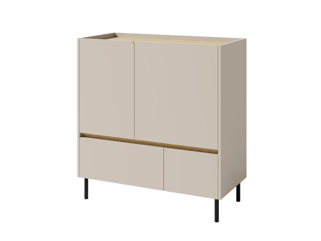 LUCA modern bézs komód magas fekete fém lábakkal. A kétfiókos komód igazán praktikus és elegáns megoldást jelent minden hálószobába vagy gyerekszobába. Minden ajtós szekrény mögött egy-egy polc helyezkedik el. Számos tároló helyet biztosít a ruhaneműknek, kiegészítőknek, fehérneműknek és egyéb apróságoknak. A tetejére is elhelyezheti a dísztárgyait vagy növényeit. A kétajtós komód minőségi laminált 16 mm vastag bútorlapból készült. Az élei pedig ABS élzárással biztosítottak.