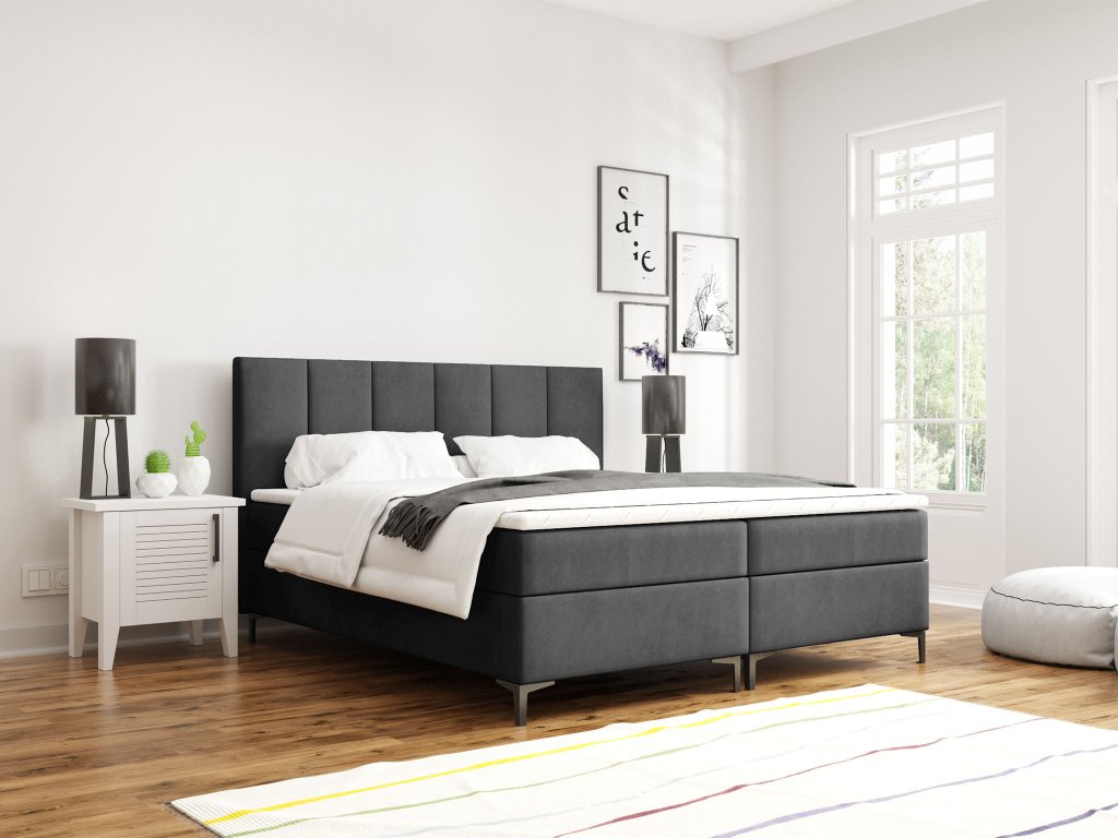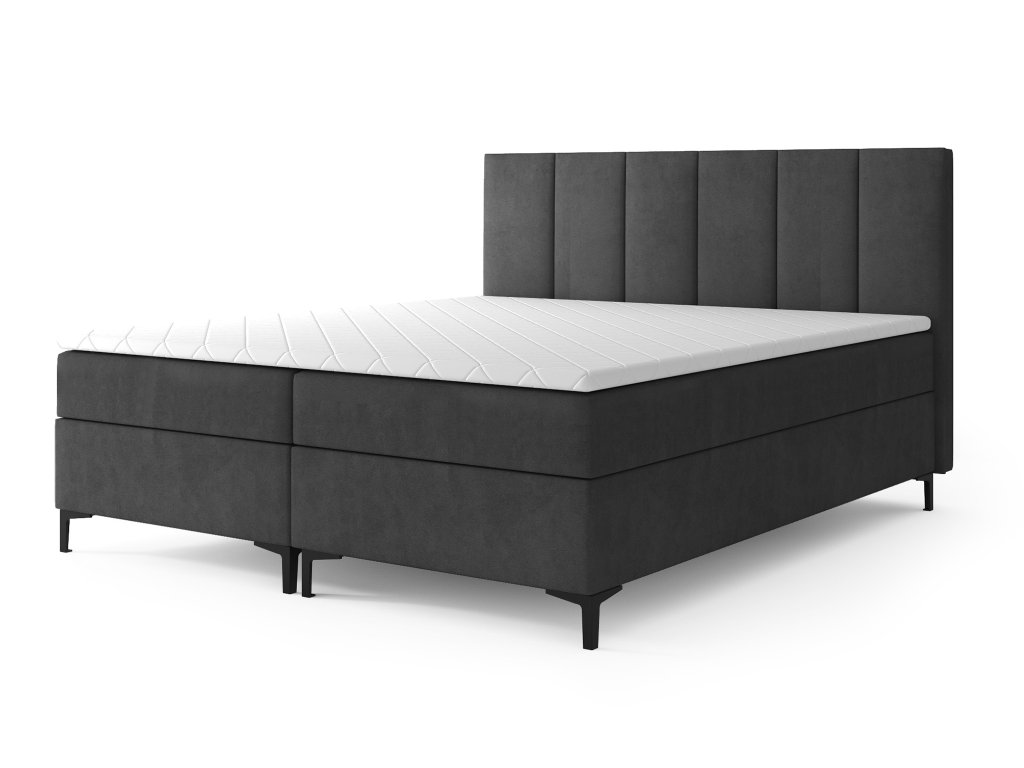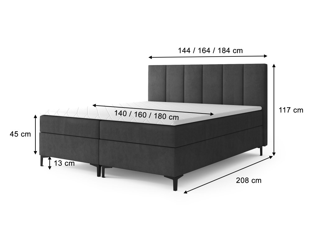 A LUIS boxspring ágy igazán gyönyörű kinézettel rendelkezik és mivel több méretben is elérhető, mindenki megtalálja a neki megfelelőt. Az ágy kerete tömör fából készül, amely biztosítja a stabilitását és az ellenálló képességét. A franciaágyhoz tartozó matrac 14 cm magas Bonell rugókkal rendelkezik, ami közepes keménységet és pihentető alvást biztosít. A LUIS ágy praktikus ágyneműtartóval is el van látva automata gázrugós nyitási rendszerrel, ami megkönnyíti a felnyitását. Az ágyneműtartó tökéletes helyet biztosít az ágynemű, párnák vagy a szezonális ruhák tárolására. A kontinentális ágy gyönyörű kárpitozott ágytámlával díszített, amely T25-ös habbal van borítva, így biztosítva a kényelmét tévénézés vagy könyvolvasás közben. A 13 cm magas fekete lábaknak köszönhetően az ágyat könnyebben át tudja helyezni szükség esetén vagy fel tud mosni alatta. Az egész ágy Isabella szövettel kárpitozott. Ez a kárpitszövet 270 g/m² grammsúllyal rendelkező 100 % poliészterből készül, amely nem csak kellemes tapintású, de igazán ellenálló az elhasználódással szemben is. Legyen hálószobájában igazi luxus és elegancia a LUIS boxspring ágynak köszönhetően.