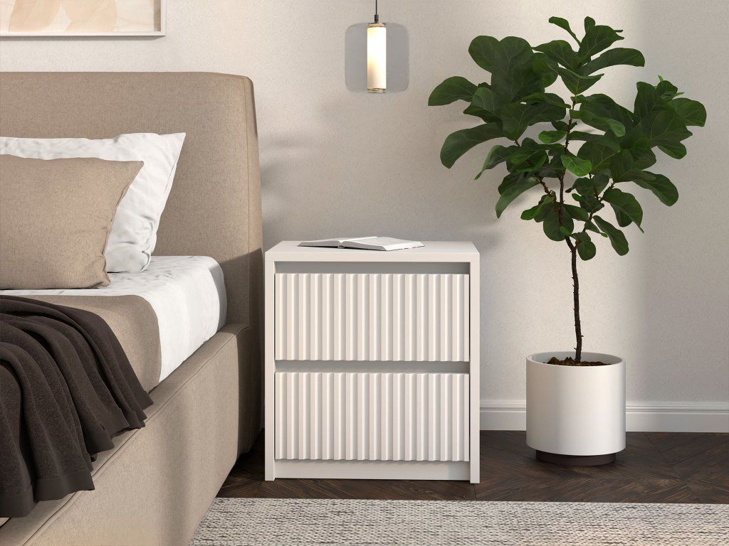 A Lumina 2 éjjeliszekrény kiváló minőségű anyagokból készült, amelyek hosszú élettartamot garantálnak és ellenállóak a mindennapi használattal szemben. A matt fehér színű felület nemcsak esztétikus, hanem könnyen tisztán tartható is. A legfeltűnőbb elemet az előlapon kialakított, függőleges marás adja, amely kiváltja a hagyományos fogantyúkat, és kiemeli a bútor letisztult, zavartalan megjelenését. A minőségi fiókok csendes és egyenletes működést biztosítanak, amit különösen a korai órákban fog értékelni.