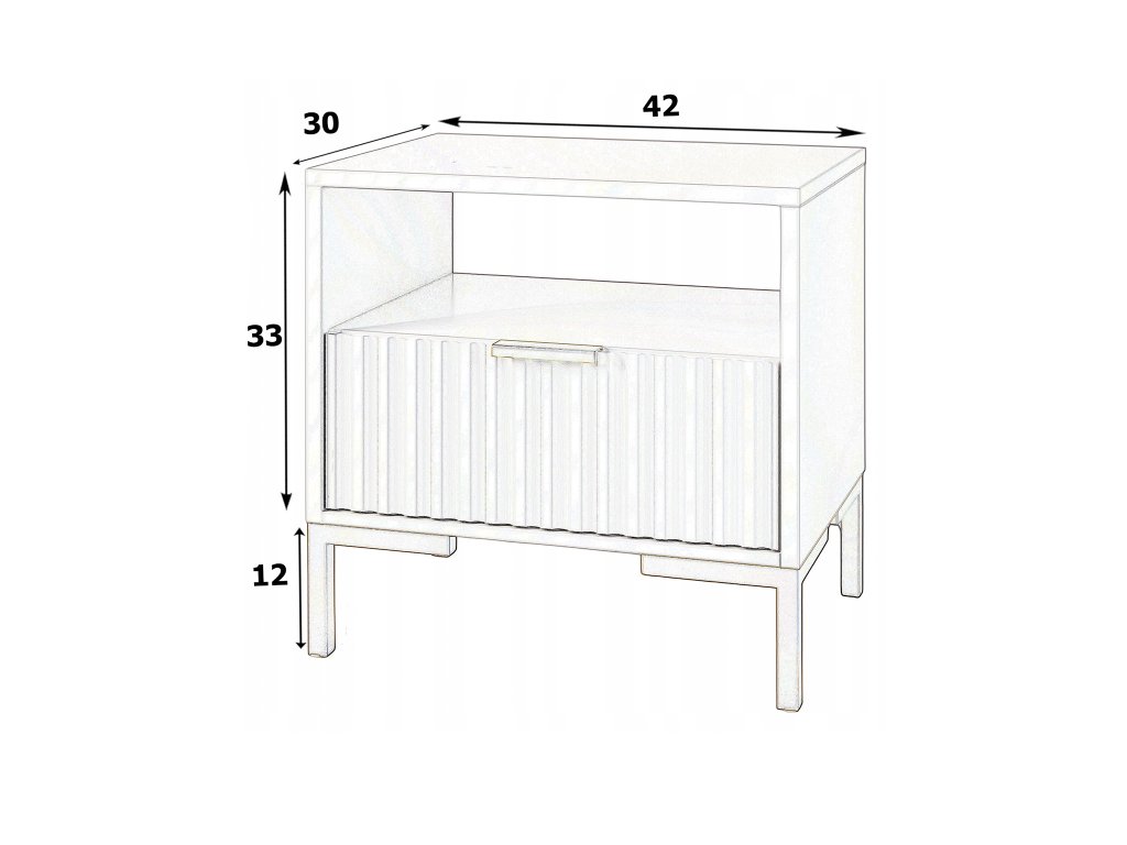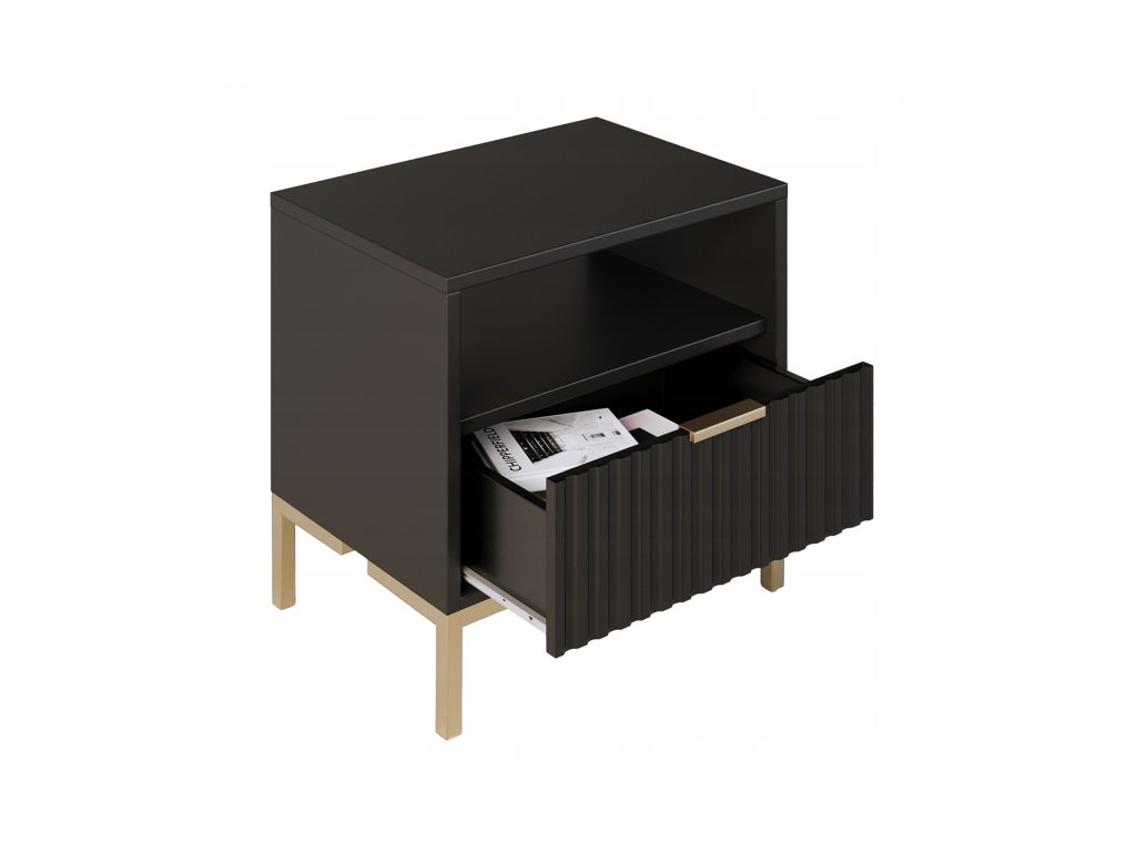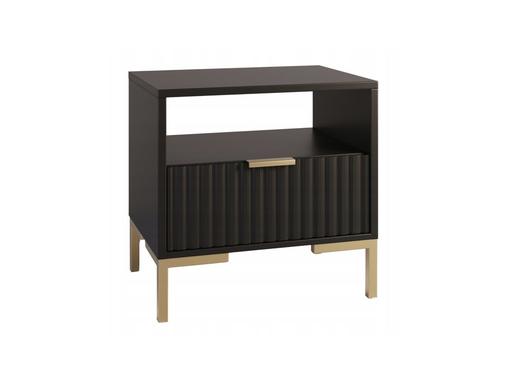 A szekrény egyik előnye a gördülősínes kihúzható polc, amely sima és csendes nyitást tesz lehetővé. Ide kényelmesen elhelyezhet könyveket, magazinokat vagy kisebb tárgyakat. A felső rész ideális lámpa vagy dekorációs elemek számára. Az éjjeliszekrény stabil, magas aranyszínű lábakon áll, amelyek eleganciát kölcsönöznek neki, míg az arany árnyalatú, szálcsiszolt alumínium fogantyúk tovább hangsúlyozzák stílusos megjelenését.