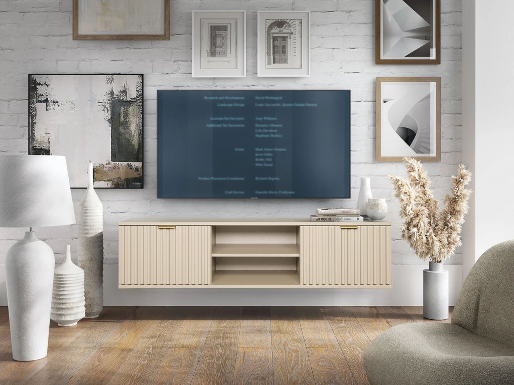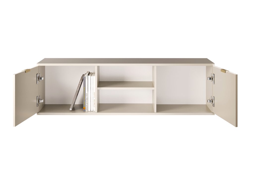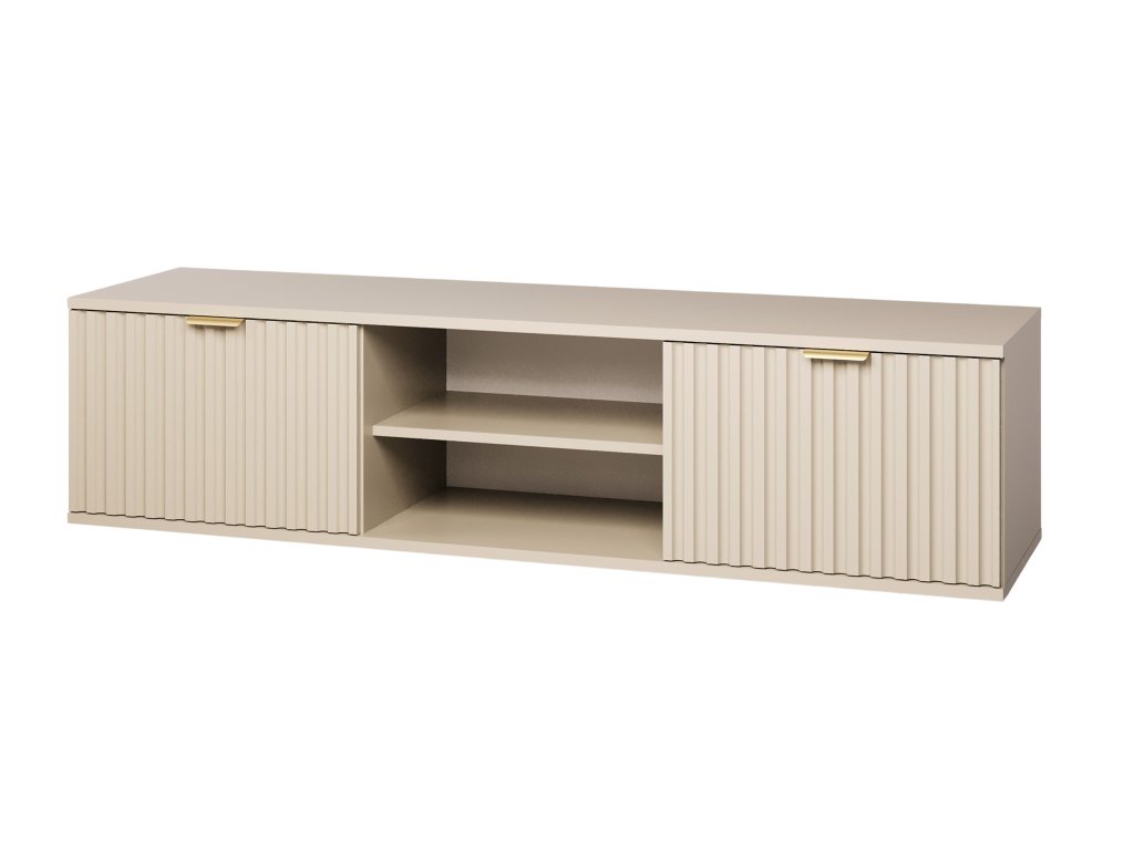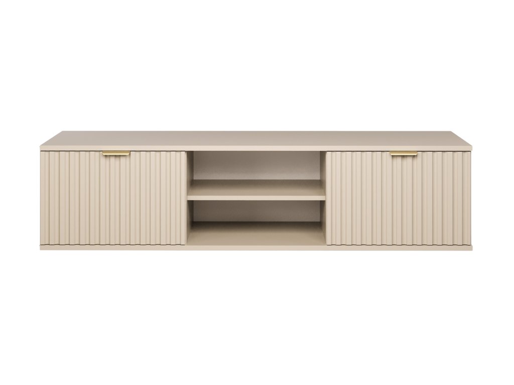 Adjon modern megjelenést otthonának a Lumina TV-állvánnyal, amely stílusos kasmír kivitelben érhető el. Ez az elegáns bútordarab ötvözi a funkcionalitást és a kifinomult dizájnt, így tökéletesen illik különböző típusú nappalikba. Magas minőségű anyagainak köszönhetően hosszú élettartamot és mindennapi használatnak való ellenállóságot biztosít. Az állvány praktikus nyitott polcot kínál multimédiás eszközök tárolására, valamint két zárt szekrényt, amelyek bőséges helyet biztosítanak minden szükséges tárgy számára. Az aranyszínű alumínium fogantyúk kényelmes és egyszerű ajtónyitást tesznek lehetővé.
