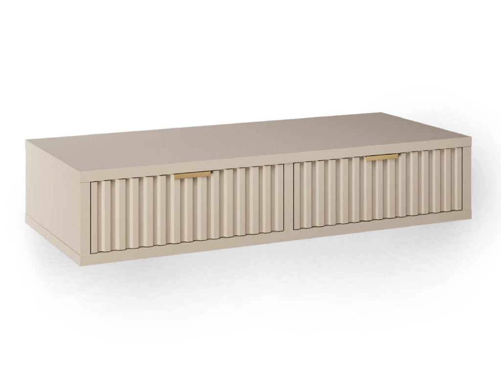 A minimalista dizájn a bordázott előlap és az arany fogantyúk kombinációjával elegáns és időtálló megjelenést kölcsönöz. A falra szerelhető kialakítás könnyed, légies hatást kelt, ugyanakkor helyet takarít meg a padlón, amit különösen a kisebb helyiségekben értékelhet.