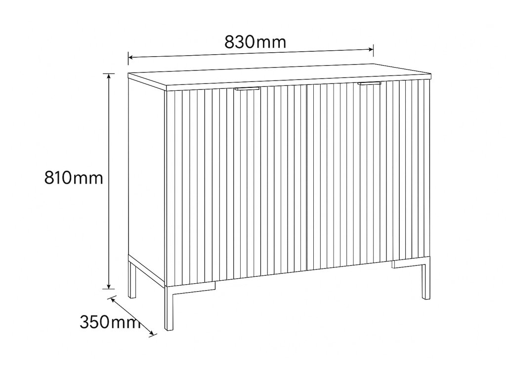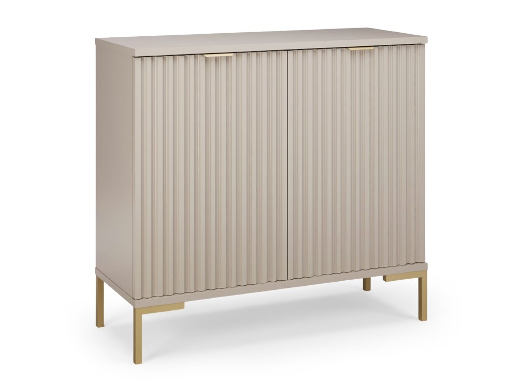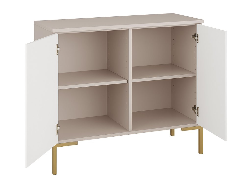 Ez a modern komód stabil, magas, arany színű lábakon áll. A fogantyúk szintén arany színű kivitelben, szálcsiszolt alumíniumból készültek. A karbantartása rendkívül egyszerű: elég egy nedves ronggyal letörölni, vagy bútortisztító szereket használni. A kétajtós komód ajtajai mögött négy polc található. A stabil szerkezete pedig biztosítja, hogy a komód évekig a szolgálatában álljon majd.