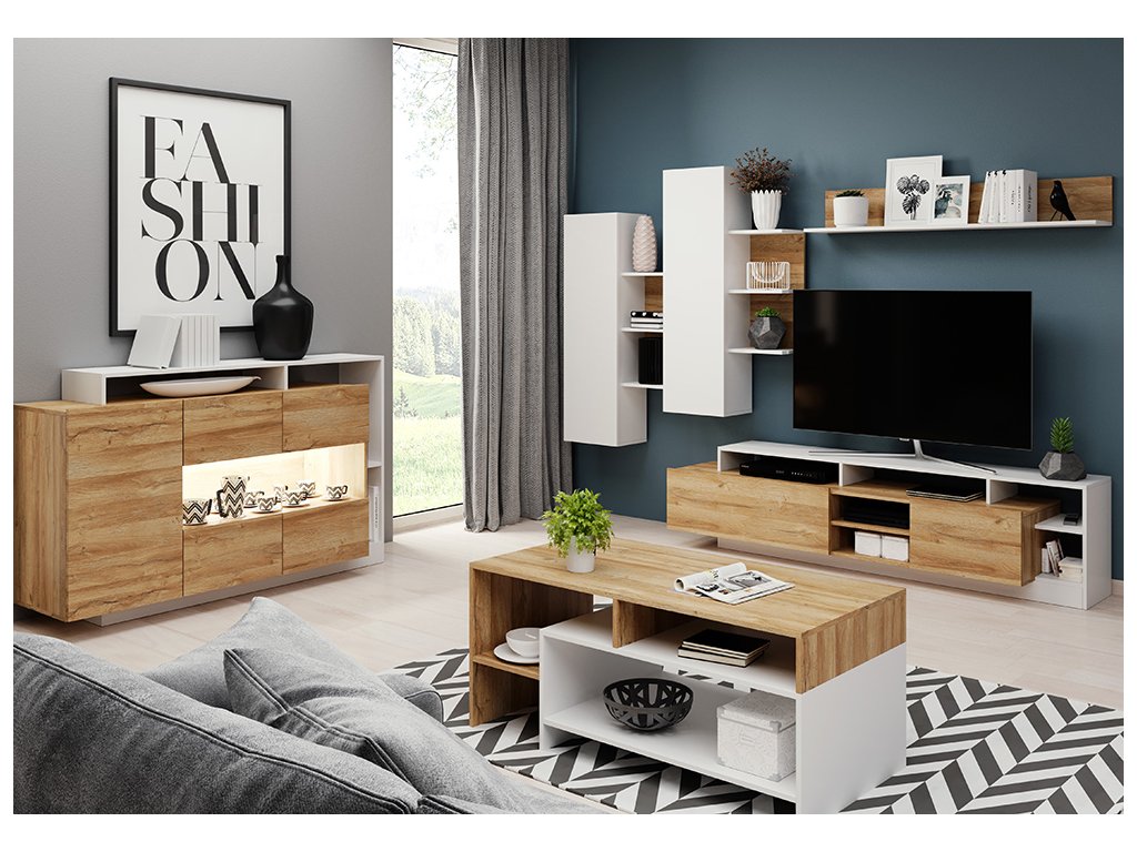 Az ALVA dohányzóasztal számos tároló helyet kínál a négy nyitott polcának köszönhetően az újságoknak és a távirányítónak. Minőségi 16 mm vastag laminált DTD bútorlapból készül, amely ellenálló a karcolásokkal, a nedvességgel és a magas hőmérséklettel szemben. A bútor szélei ABS élekkel vannak biztosítva, és fogantyú nélküli rendszerrel van ellátva. Semleges fehér és grandson tölgy kombinációjában kapható.