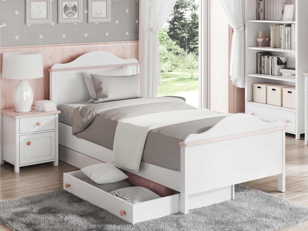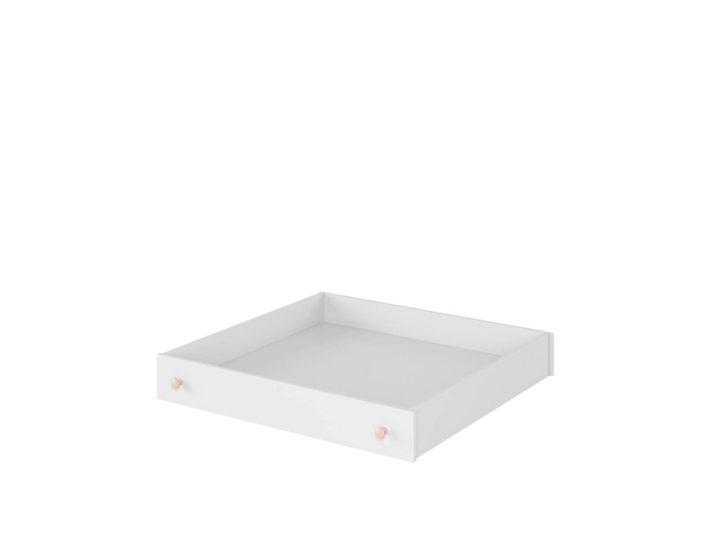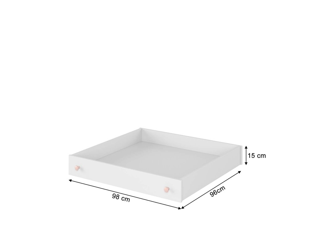 Fehér ágyneműtartó tároló fiók a LUNA egyszemélyes ágyhoz. Az ágyneműtartó rózsaszín fogantyúkkal rendelkeznek, amelyeknek köszönhetően könnyű a vele való manipuláció. Az ágyneműtartó helyet biztosít a takaróknak és a párnak. Az egyszemélyes LUNA ágy alá két ágyneműtartó fér el egymás mellé.