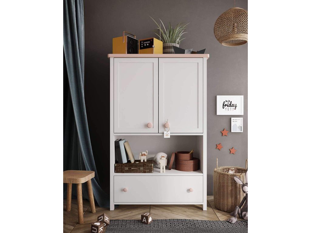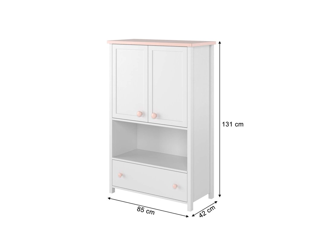 A magas fehér LUNA komód egy tágas fiókkal, egy nyitott polccal és egy kétajtós szekrénnyel rendelkezik a felső részében. A púderrózsaszín és a fehér szín kombinációja soha nem megy ki a divatból, amennyiben lányos gyerekszobákról van szó. Különböző fehér bútorokkal tökéletesen kombinálható. A provanszi stílus kedvelőinek pedig egy kötelező darab. A kínálatunkban szereplő bútorokkal tökéletes lányos gyerekszobát rendezhet be akár kamaszoknak is.