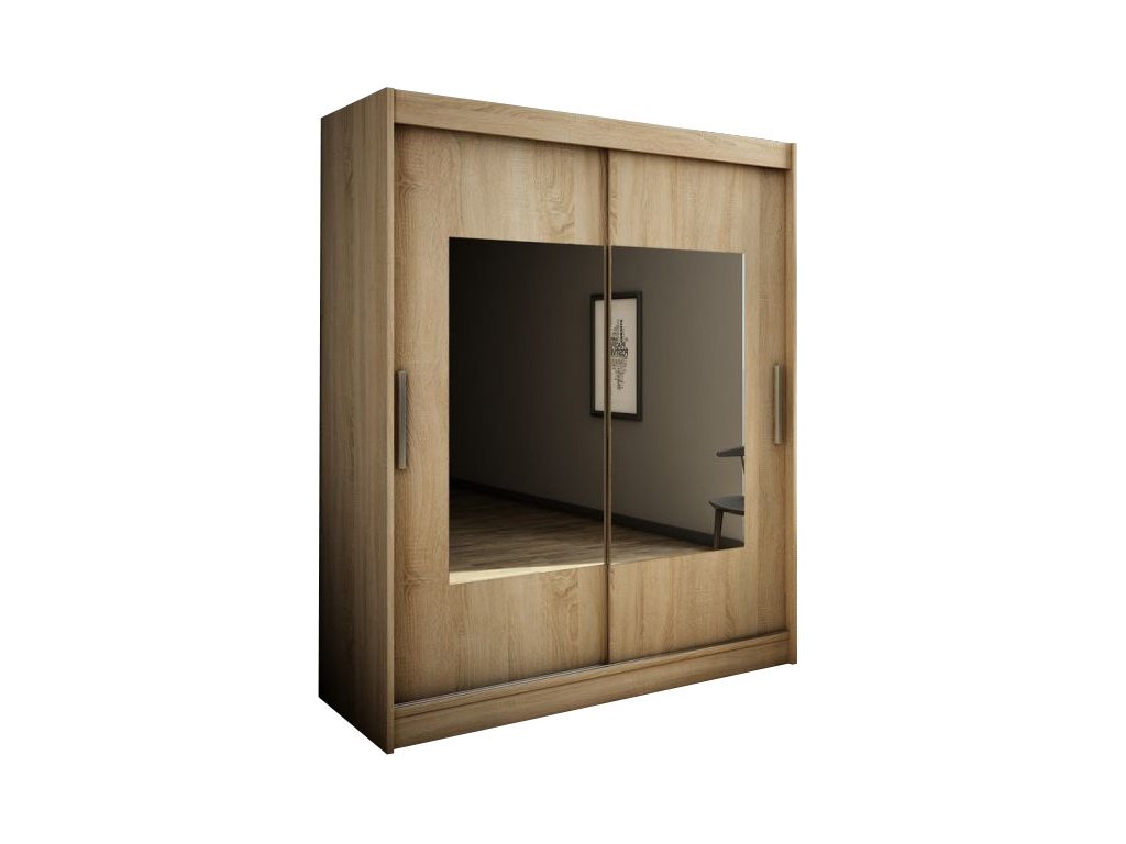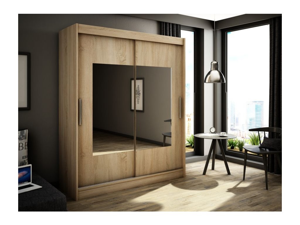Tágas LUPI tolóajtós ruhásszekrény, amely rengeteg tároló helyet kínál. A sonoma tölgy színű gardróbszekrény bútorlapból készült, a szélei pedig PVC élekkel vannak biztosítva. A tolóajtós szekrény ajtajain két nagy tükör található.A ruhásszekrény nagy előnye a "BIMAK" tolóajtó rendszer és az alumínium vezetősín, amelyek biztosítják a szekrény kényelmes és zavartalan használatát. A szekrény belseje három részre van osztva. A két oldalán praktikus polcok találhatók, négy a jobb és négy a bal oldalon. (A fiókok nem részei a szekrénynek.) Középen egy polc és két akasztórúd található, amely a szekrény része.