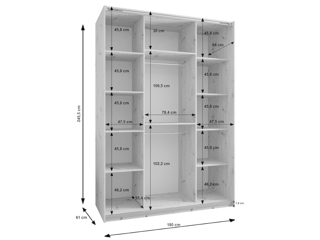 A Luxeon 4 szekrény tolóajtói kiváló minőségű HETTICH TopLine L mechanizmussal csillapított záródással rendelkeznek, amely csendes és sima működést biztosít. A szerkezet stabilitását fém sínpárok támogatják, míg az acélból készült ezüst fogantyúk kifinomult részletet adnak hozzá. A szekrény belső tere praktikus használatra lett tervezve. Két akasztós rész és több polc található benne a ruhák, kiegészítők vagy szezonális tárgyak kényelmes tárolására. A porvédő kefék megvédik a tartalmat a szennyeződésektől, és biztosítják, hogy a szekrény tiszta és rendezett maradjon. Az egész dizájn úgy lett kialakítva, hogy a szekrény használata kényelmes és problémamentes legyen sok éven át.