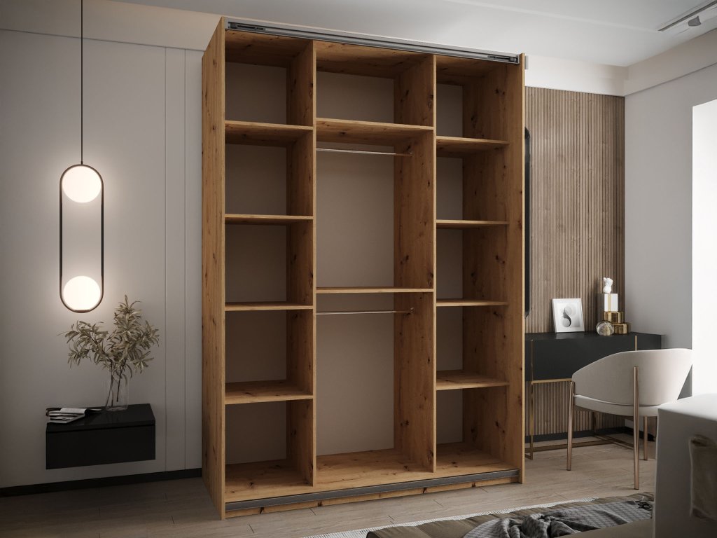 A Luxeon 4 tolóajtós szekrény precíz HETTICH TopLine L rendszerrel van felszerelve csillapított záródással, amely csendes és sima működést garantál. A stabilitást és megbízhatóságot fém sínpárok biztosítják, míg az acél fogantyúk ezüst színben kifinomult részletet adnak. A belső tér funkcionális hangsúlyt kapott – tartalmaz két akasztós rekeszt ruhák számára és több polcot, amelyek lehetővé teszik a ruhák és kiegészítők praktikus elrendezését. A porvédő kefék megvédik a szekrény belsejét a szennyeződésektől, és az egész dizájn átgondolt, hogy a használat kényelmes és hosszú távon problémamentes legyen.