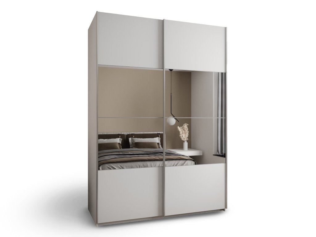 Bútort keres, amely ötvözi a stílusos megjelenést a praktikus használattal? Luxeon 4 egy fehér tükrös ruhásszekrény, amely nagyobb térérzetet hoz a belső térbe. Az elülső csiszolt tükröknek köszönhetően a helyiség légies és modern hatást kelt. A szekrény alkalmas a hálószobába, előszobába vagy vendégszobába, és semleges fehér színe kiegészíti a különböző berendezési stílusokat. A korpusz és az ajtók 16 mm vastag laminált lapból készültek, amely erős és ellenálló a sérülésekkel szemben, és a 0,5 mm-es ABS furnér élzárás biztosítja a hosszú élettartamot és az elegáns megjelenés megőrzését. Az elülső panelek négy szegmensre vannak osztva, ami kiegyensúlyozott és modern dizájnt eredményez.