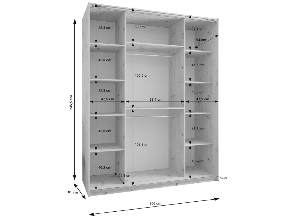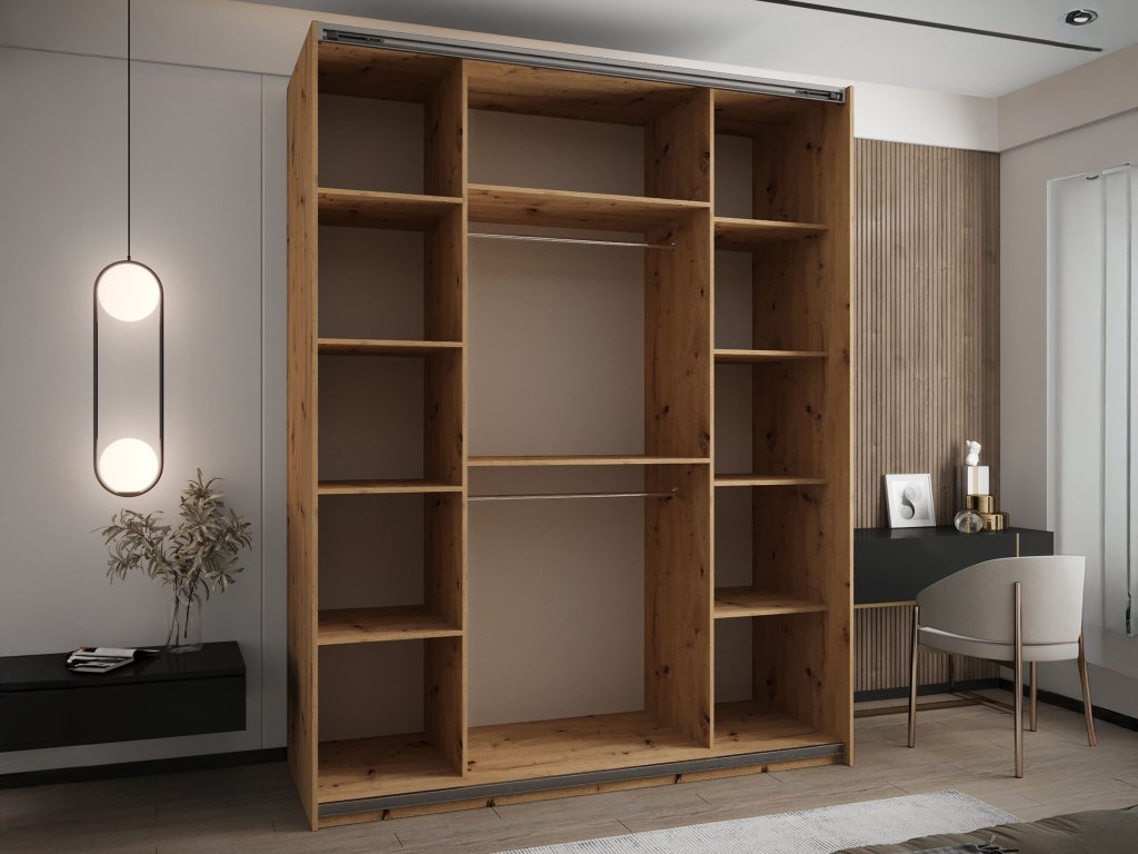 A HETTICH TopLine L csúszómechanizmus csillapított záródással csendes és sima ajtómozgást biztosít, míg a fém sínpárok stabilitást adnak az egész szerkezetnek. Az ezüst fogantyúk diszkrét luxus részletet adnak a bútornak. A szekrény belső tere praktikus tárolásra lett tervezve – tartalmaz több polcot a ruhák, kiegészítők vagy szezonális dolgok rendezésére, és a porvédő kefék megvédik a tartalmat a szennyeződésektől. Így a szekrény mindig tiszta, áttekinthető és készen áll a mindennapi használatra.