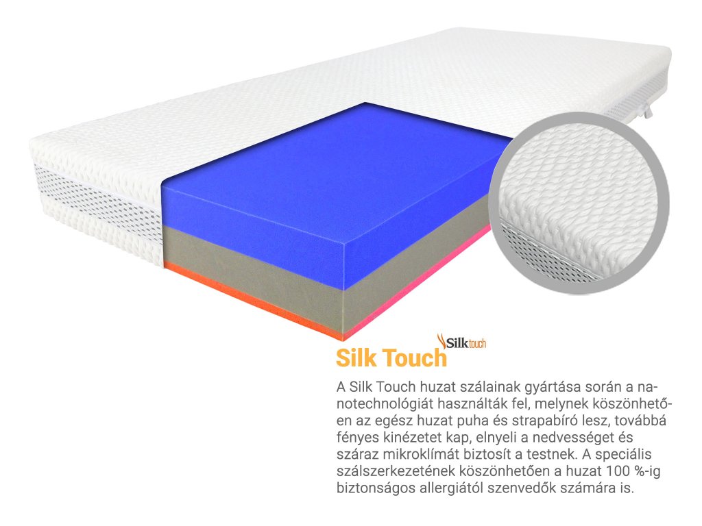 A matrac az úgynevezett exkluzív Silk Touch huzattal rendelkezik, amely nem csak hiehetlenül puha és kellemes tapintású, de időtálló is.A 3D szellőző egy innovatív technológia, amely biztosítja a matrac hatékony szellőzését és az optimális légáramlást. A huzat hatékonyan elnyeli a nedvességet, így frissen és szárazon tartja a matracot. A Silk Touch huzat allergiások számára is megfelelő, antibakteriális tulajdonságokkal rendelkezik és probléma nélkül akár 60 fokon is mosható.