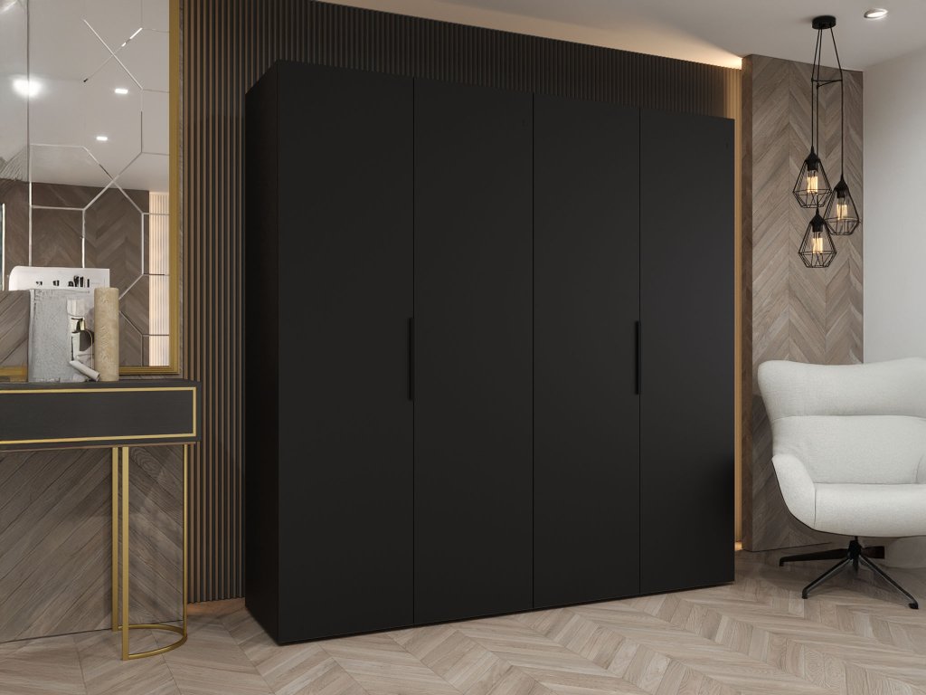 A matt fekete színű MARBELLA 1 gardróbszekrény két darab kétajtós ruhásszekrényből áll. Ez a négyajtós szekrény gyönyörű fekete színben készül, elegáns fekete színű alumínium fogantyúkkal. Megállja a helyét szinte bármelyik szobában, legyen szó az előszobáról, a hálószobáról vagy a nappaliról. A számos tárolóhellyel rendelkező gardróbszekrény minőségi laminált bútorlapból készül matt felülettel, amely nagyon ellenálló a sérülésekkel szemben. Ehhez társul még a PVC élzárás, amely hosszú élettartamot biztosít. A szekrény belsejében két fém akasztórúd kapott helyet, fölöttük pedig egy-egy praktikus polcot talál, amelyek együtt elegendő helyet biztosítanak a ruhái tárolására. A bútor hátlapja HDF farostlemezből készül.