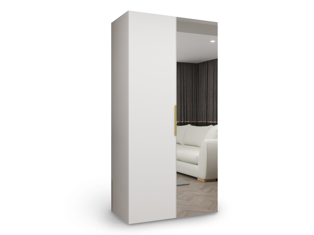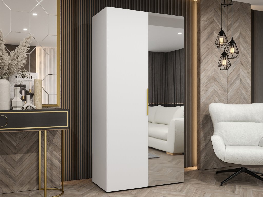Stílusos és praktikus szekrényt keres, amely minden helyiség bútorához illeszkedik? A Marbella 2 100 gardróbszekrény a tökéletes választás. Szélessége eléri a 100 cm-t, klasszikus fehér színben, matt felülettel készült. Ez a szekrény masszív, 16 mm vastag laminált lapból készült. A jobb oldali ajtón egy nagy, praktikus tükör található. A fehér szekrényt elegáns, aranyszínű alumínium fogantyúk díszítik. A Marbella 2 szekrény belsejében mindent megtalál, ami a rendszerezéshez szükséges: egy fém akasztórúd a ruhák felakasztásához, fölötte pedig egy masszív polc, ahová összehajtott ruhákat, kiegészítőket vagy dobozokat helyezhet. Az ajtók egyszerűen és kényelmesen nyithatók. A szekrény élei tartós PVC élzárással védettek, így nem sérülnek könnyen. A hátoldalon található erős HDF lapnak köszönhetően a szekrény nagyon stabil és hosszú élettartamú. Ezeknek a pozitív tulajdonságoknak köszönhetően elhelyezheti akár a nappaliban, hálószobában, előszobában vagy a gyerekszobában is.