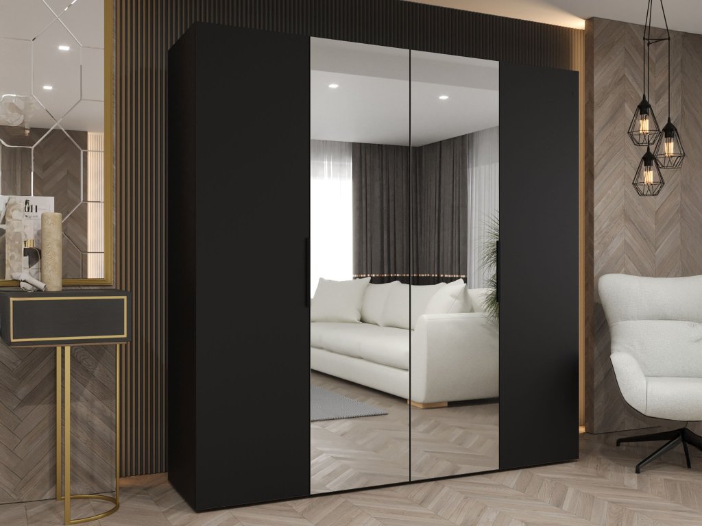 Több tárolóhelyre van szüksége a hálószobában, az előszobában vagy a gyerekszobában? A Marbella 2 négyajtós gardróbszekrény matt fekete színben elegáns megjelenést kínál, miközben praktikus megoldást nyújt a mindennapi tárolásra. A 200 cm-es szélesség bőséges helyet biztosít ruházat és kiegészítők számára. A szekrény két darab Marbella 2 100-as elemből áll össze, így moduláris és jól variálható megoldás. Az ajtókon található beépített tükör nemcsak hasznos a mindennapi öltözködésnél, de optikailag tágasabbá teszi a teret is. A finoman matt felülethez illő fekete alumínium fogantyúk tovább fokozzák a bútor letisztult és modern megjelenését. A szekrény belső tere átgondolt kialakítású: a tartós fém akasztórudak kiválóan alkalmasak ruhák, ingek vagy kabátok felakasztására, míg a fölöttük elhelyezett masszív polcok ideálisak összehajtott ruhadarabok, dobozok vagy szezonális kiegészítők tárolására. A szerkezet kiváló minőségű, 16 mm vastag laminált lapból készül, megerősített PVC élekkel és HDF hátfallal, ami hosszú élettartamot és stabilitást garantál még intenzív, mindennapi használat mellett is.