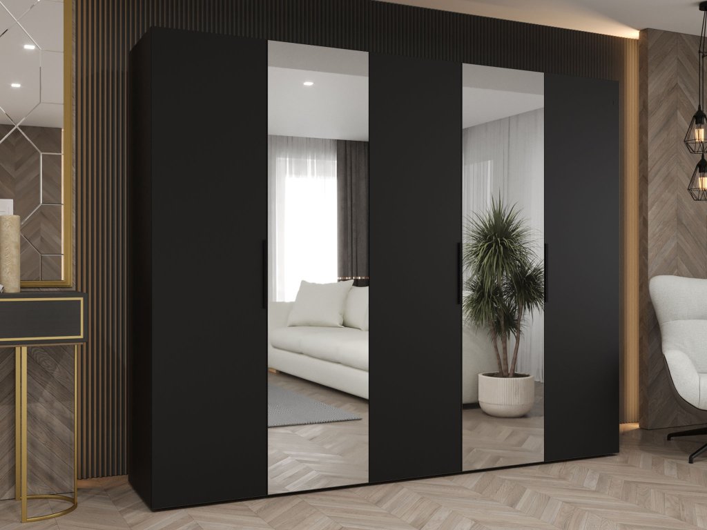 A modern dizájn, a praktikus tárolóhely és az átgondolt összeállítás mind jellemzői a Marbella 2 250 gardróbszekrénynek. A 250 cm-es szélességű, matt fekete felületű szekrény bármilyen modern enteriőrbe kiválóan illeszkedik – legyen szó hálószobáról, előszobáról vagy gyerekszobáról. A gardróbszekrény két különálló elemből, a Marbella 2 100 és a Marbella 2 150 részből áll, amelyek együtt tágas egységet alkotnak. A négyajtós szekrényben fém akasztórudak találhatók a ruhák felakasztásához, fölöttük pedig masszív polcok helyezkednek el, amelyek ideálisak kiegészítők, összehajtott ruhák vagy tárolódobozok elhelyezésére. Az ajtókat nagyméretű tükrök teszik teljessé, amelyek egyben optikailag tágítják a teret is. A letisztult, elegáns összhatást a fekete alumínium fogantyúk erősítik tovább, amelyek stílusosan kontrasztálnak a finoman matt felülettel. A szekrény stabilitását és hosszú élettartamát a minőségi, 16 mm vastag laminált lapból készült szerkezet, a masszív HDF hátfal és a megerősített PVC élek biztosítják, amelyek védelmet nyújtanak a mindennapi igénybevétellel szemben.