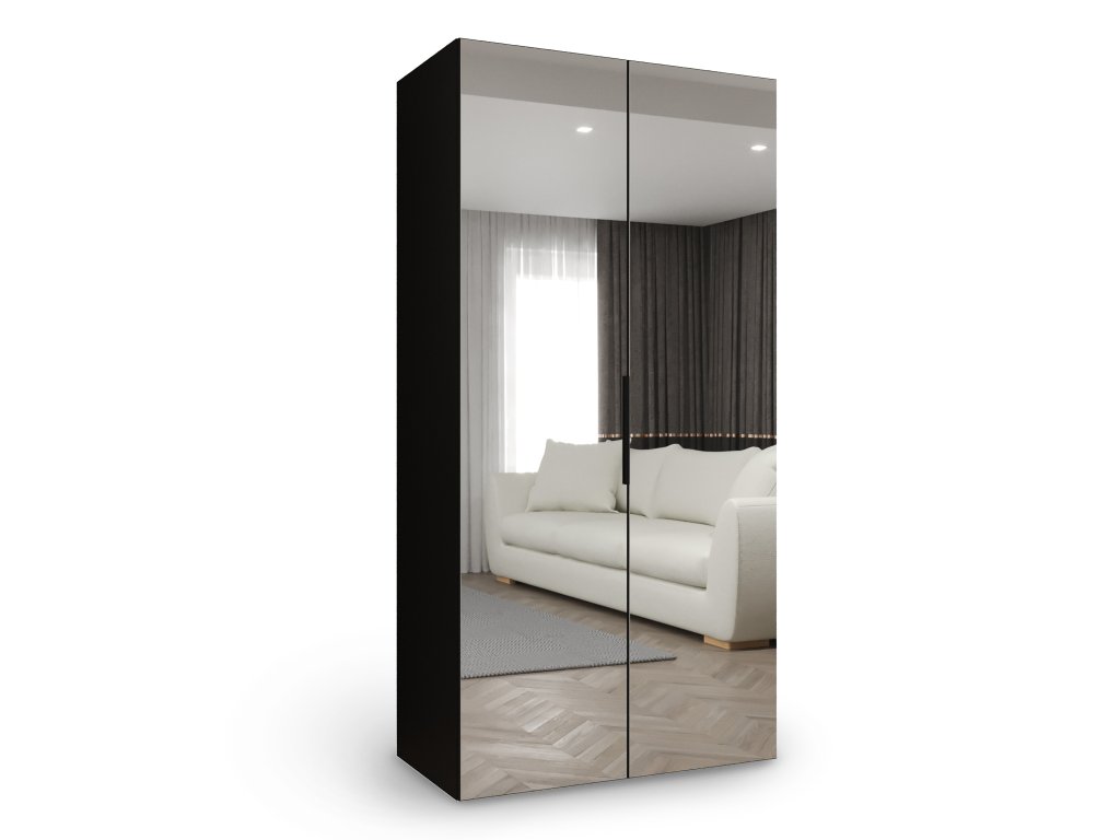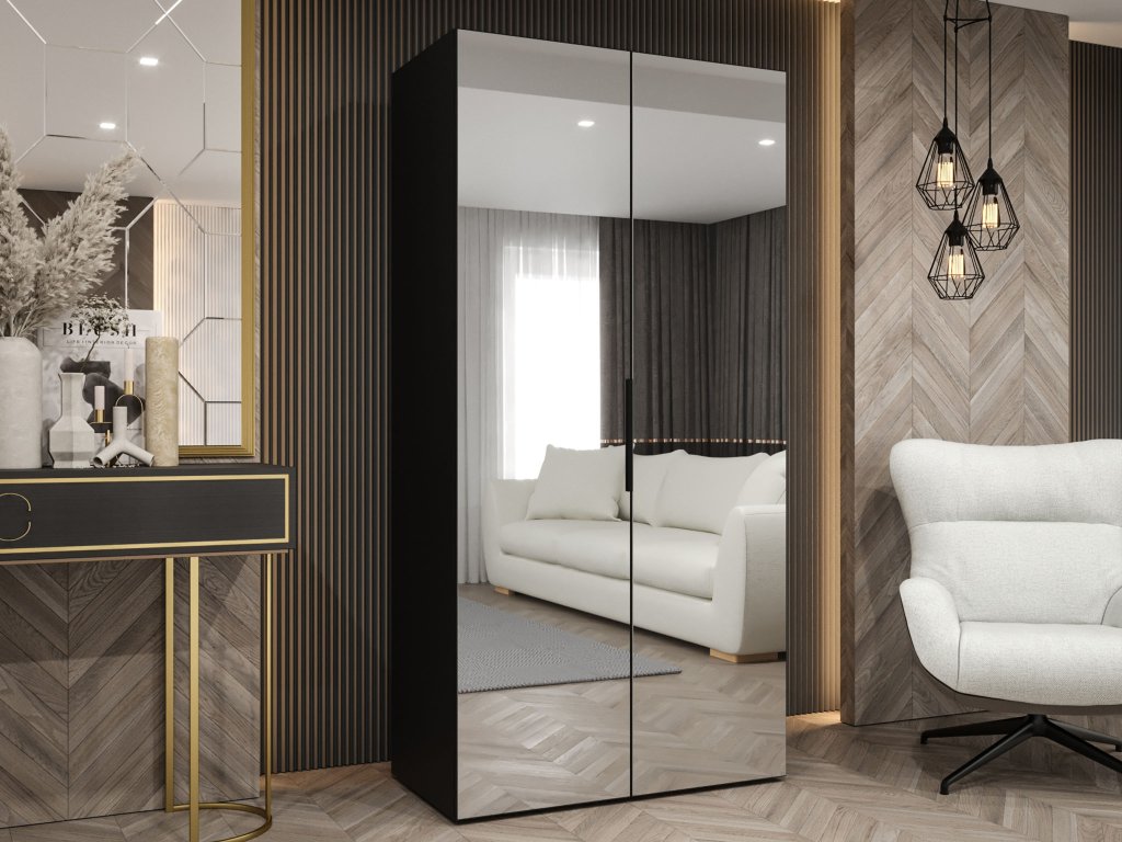 A Marbella 3 gardróbszekrény időtlen fekete színben ideális választás minden helyiségbe, legyen szó hálószobáról, előszobáról vagy vendégszobáról. Dizájnjának és semleges árnyalatának köszönhetően könnyedén illeszkedik a különböző enteriőr stílusokhoz. A szekrény szerkezete strapabíró laminált lapból készült, az élek erős PVC élzárást kaptak, ami meghosszabbítja az élettartamát. A teljes szerkezet stabilitását a minőségi HDF hátlap biztosítja. Az elülső ajtókon található tükör elegáns és praktikus megjelenést kölcsönöz a szekrénynek. Az ajtók kifelé nyílnak, puha záródású rendszerrel vannak ellátva, így csendesen és könnyedén záródnak. A fekete alumínium fogantyúk modern kontrasztot alkotnak, és növelik a mindennapi használat kényelmét. Belül egy praktikus fém akasztórúd található a ruhák felakasztásához, valamint egy masszív polc, amely további tárolóhelyet biztosít.