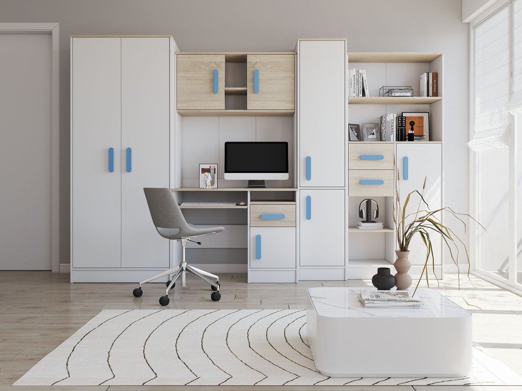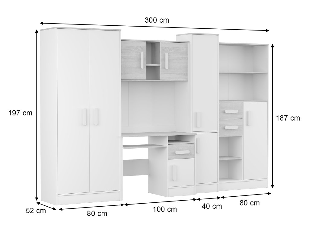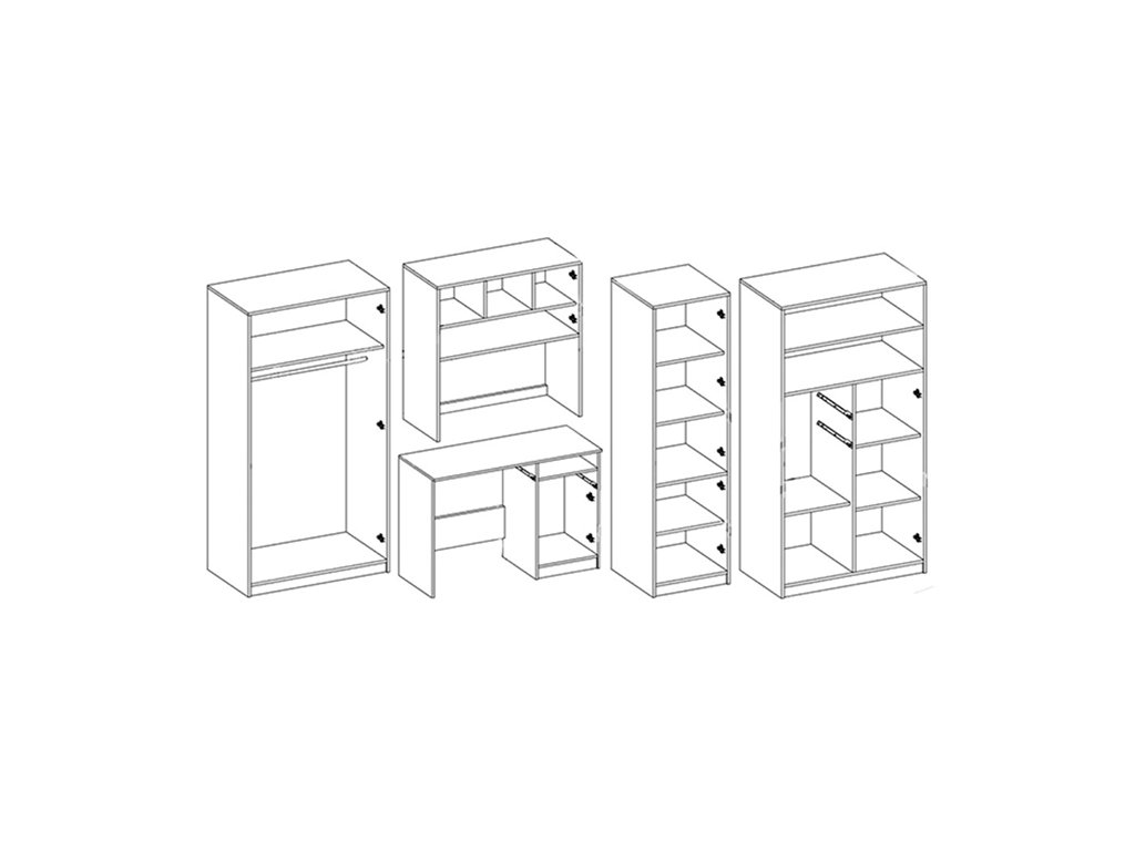A Markus tanulószoba 5 db bútorból áll: íróasztal, ruhaszekrény, 2 db polcos szekrény és íróasztal feletti polcok. A szekrénysor minden eleme önálló, ezért a gyerekszobát bármilyen kombinációban berendezheti.