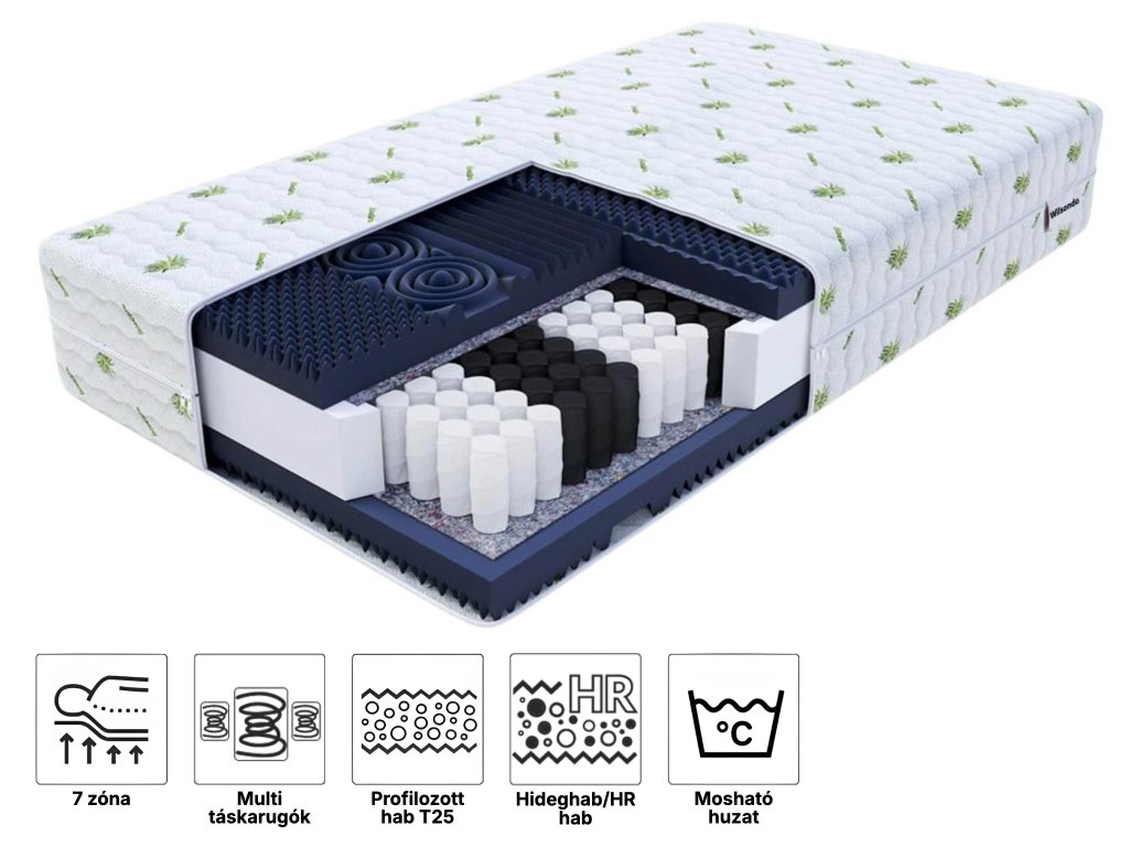 Anyagösszetétel: filc, multipocket rugórendszer, 25 kg/m3 sűrűségű poliuretán hab, profilozott HR hab, huzat