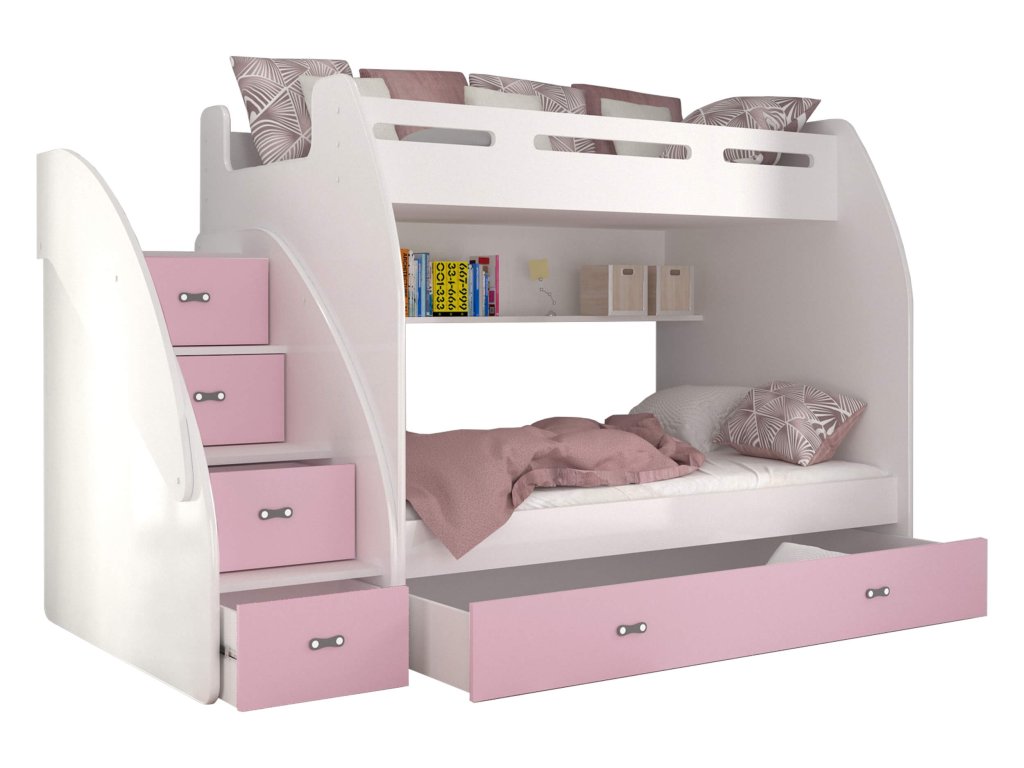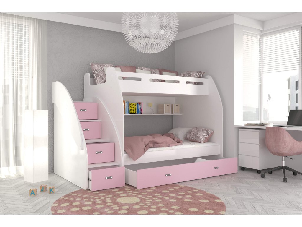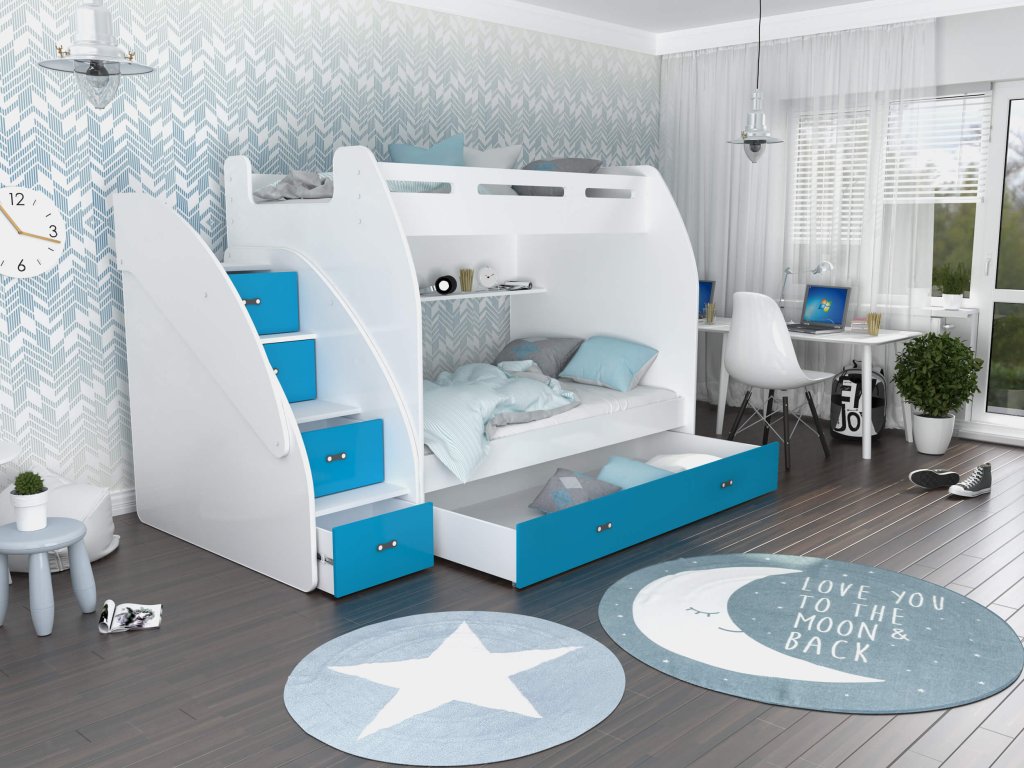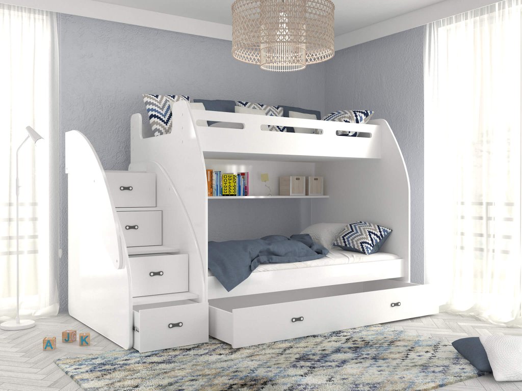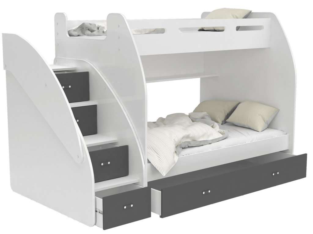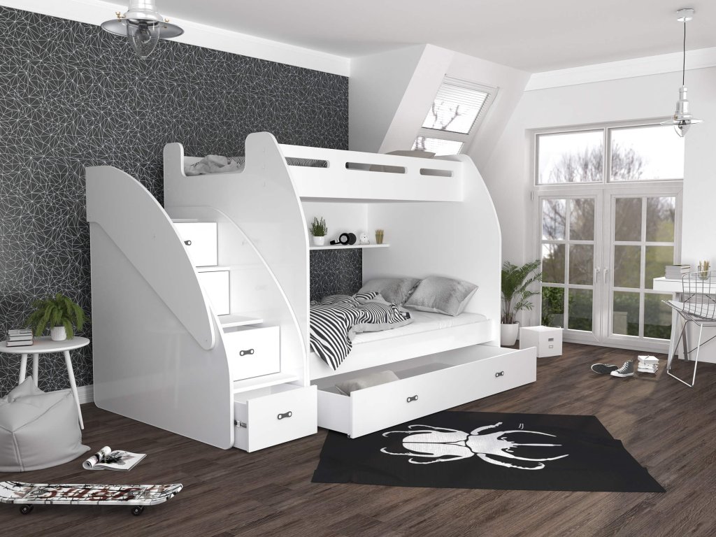 A gyerekszoba berendezésén gondolkodik és tanácstalan, hogy mi lenne a legjobb megoldás arra, hogy helyet takarítson meg a szobában? Ez a multifunkciós ágy a megoldás a problémájára. A két fő fekhely mellett számos tárolóval is rendelkezik: a lépcsőfokokba rejtett fiókoknak, a praktikus polcnak és a nagy, kerekeken mozgatható tároló fióknak köszönhetően. Az ágy DTD és MDF deszkák kombinációjából készült különböző színváltozatokban. Az ágy univerzális: összeszereléskor kiválaszthatja, hogy jobb vagy bal oldalra szeretné a lépcsőt. Az ágy univerzális: összeszereléskor kiválaszthatja, hogy jobb vagy bal oldalra szeretné a lépcsőt.