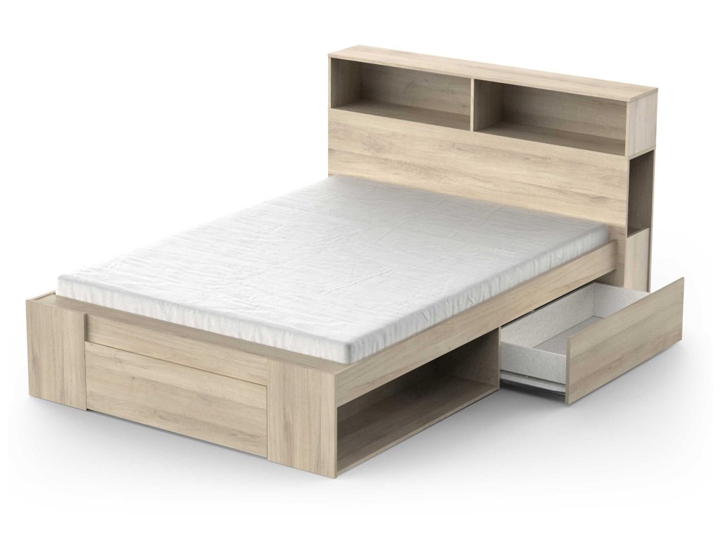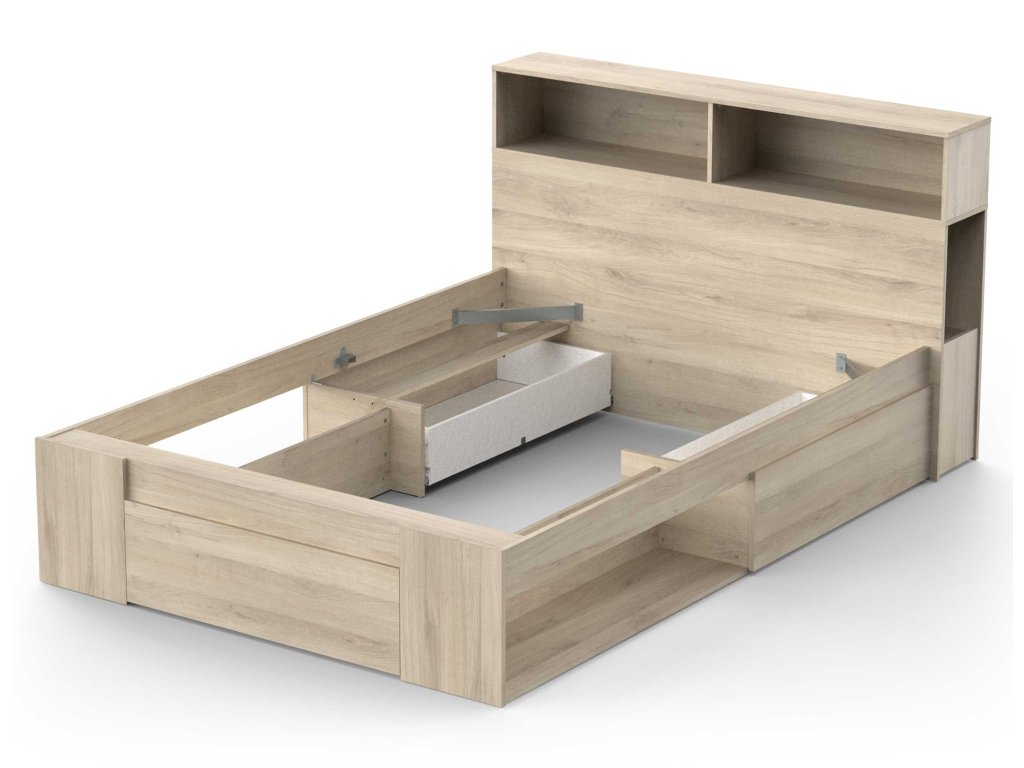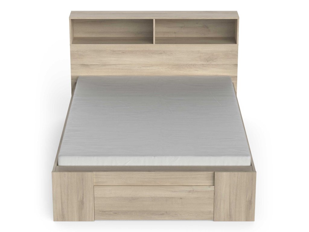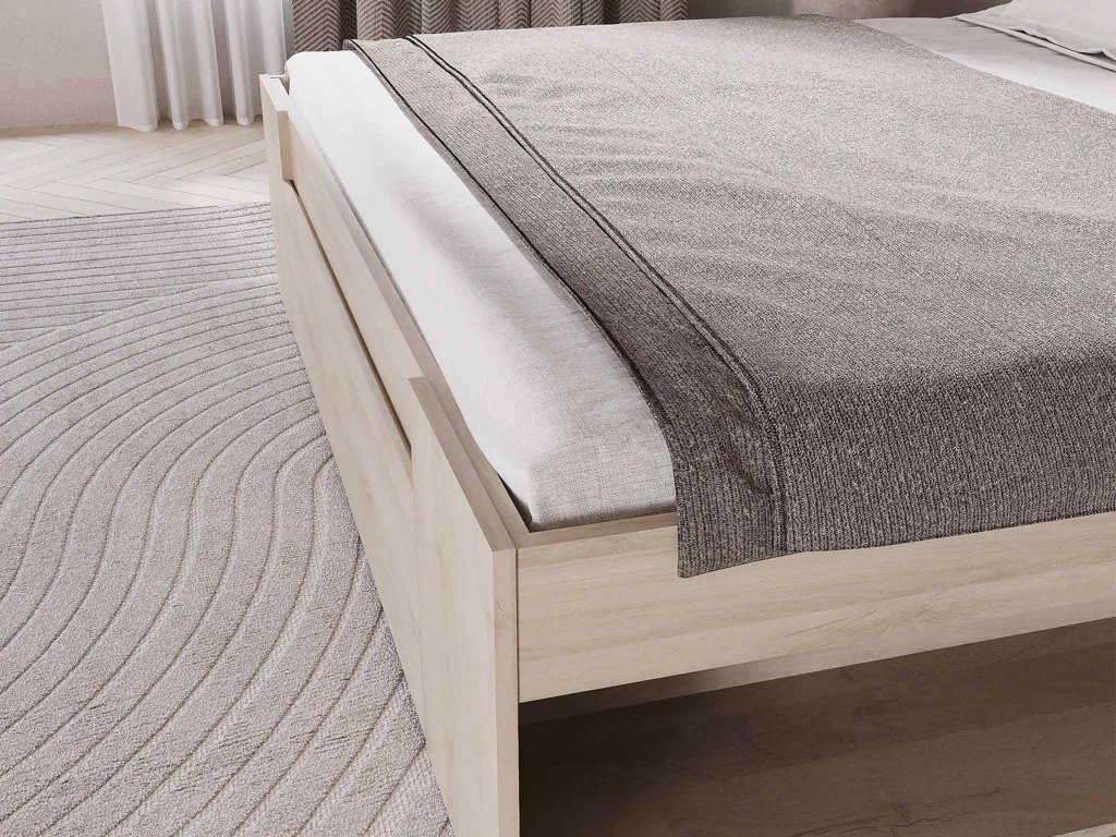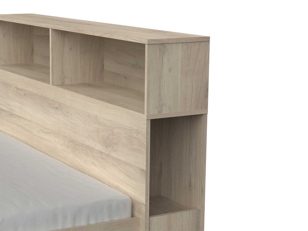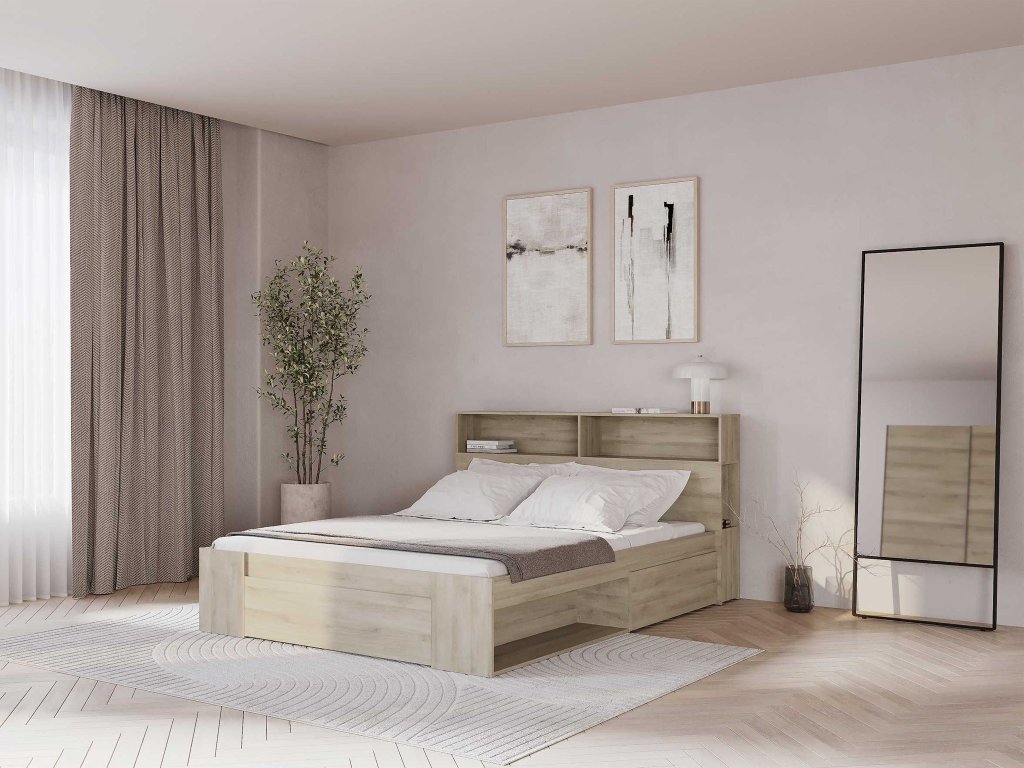 A MAXIMAX franciaágy letisztult, minimalista stílusával és világos Kronberg tölgy színével hívja fel magára a figyelmet, amely modern hangulatot visz a hálószobába. Az ágy kiváló minőségű melamin bevonatú forgácslapból készült, amely ellenáll a karcolásoknak és nagyon könnyen tisztán tartható. Masszív szerkezetének köszönhetően stabilitást és hosszú élettartamot garantál. A Maximax kétszemélyes ágy nagy előnye, hogy a fekvőfelület alatt három tágas ágyneműtartó tároló fiók található, amelyek ideálisak az ágynemű, a párnák, a paplanok vagy a szezonális ruhák elhelyezésére. Az ágytámlában is négy nyitott beépített rekesz található, amelyek éjjeliszekrényként vagy könyvespolcként is használhatók.