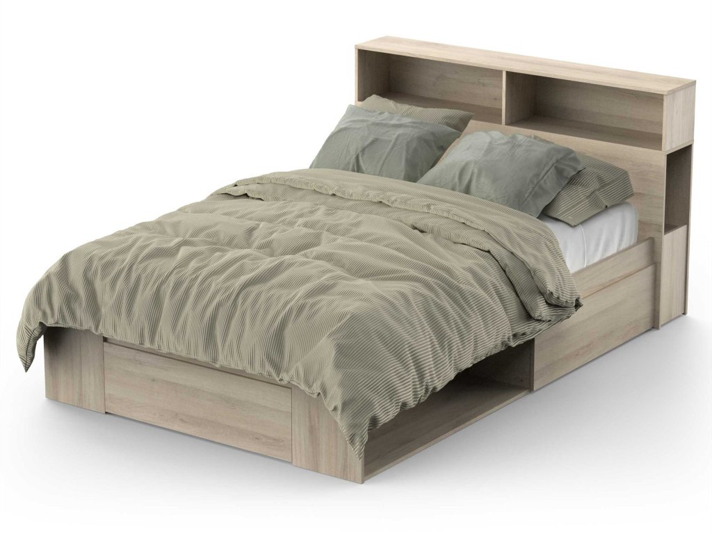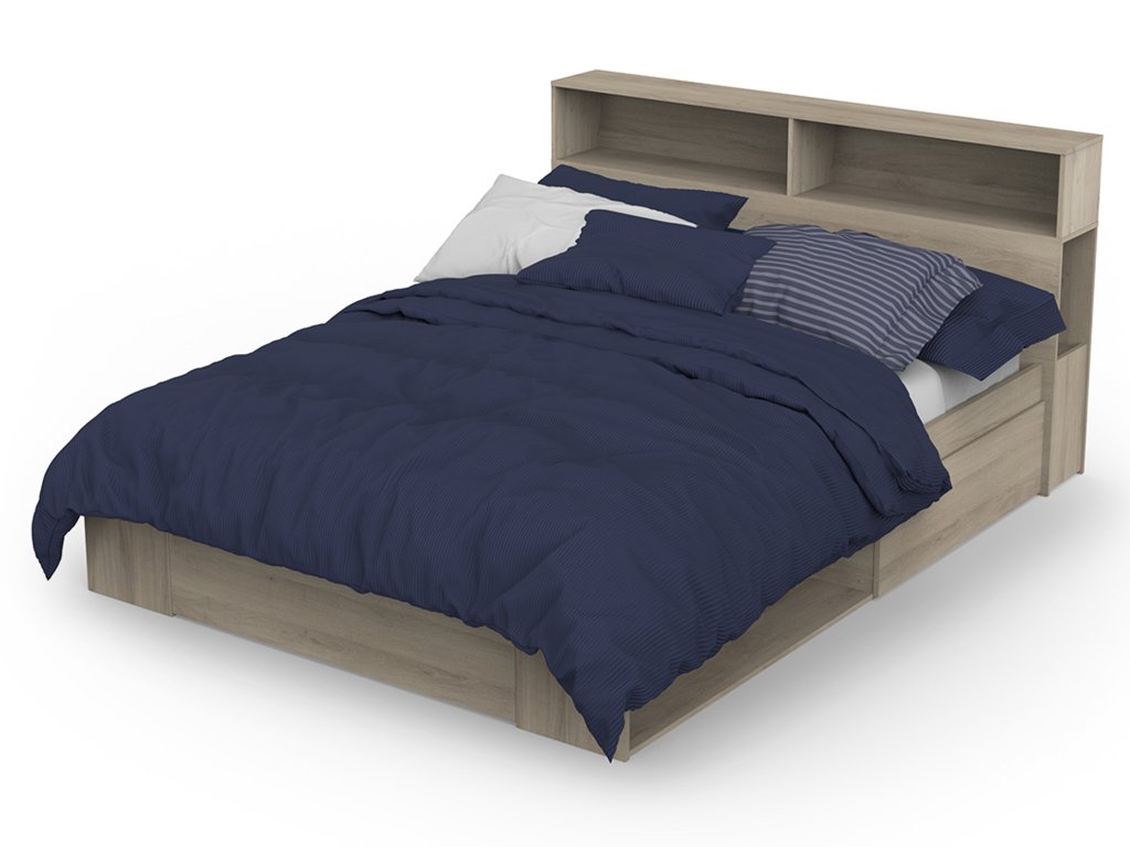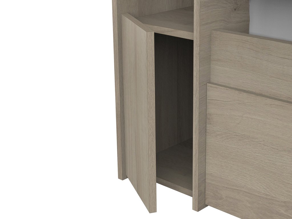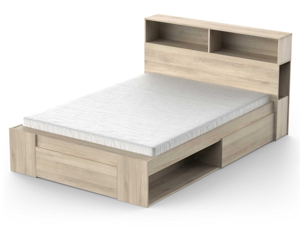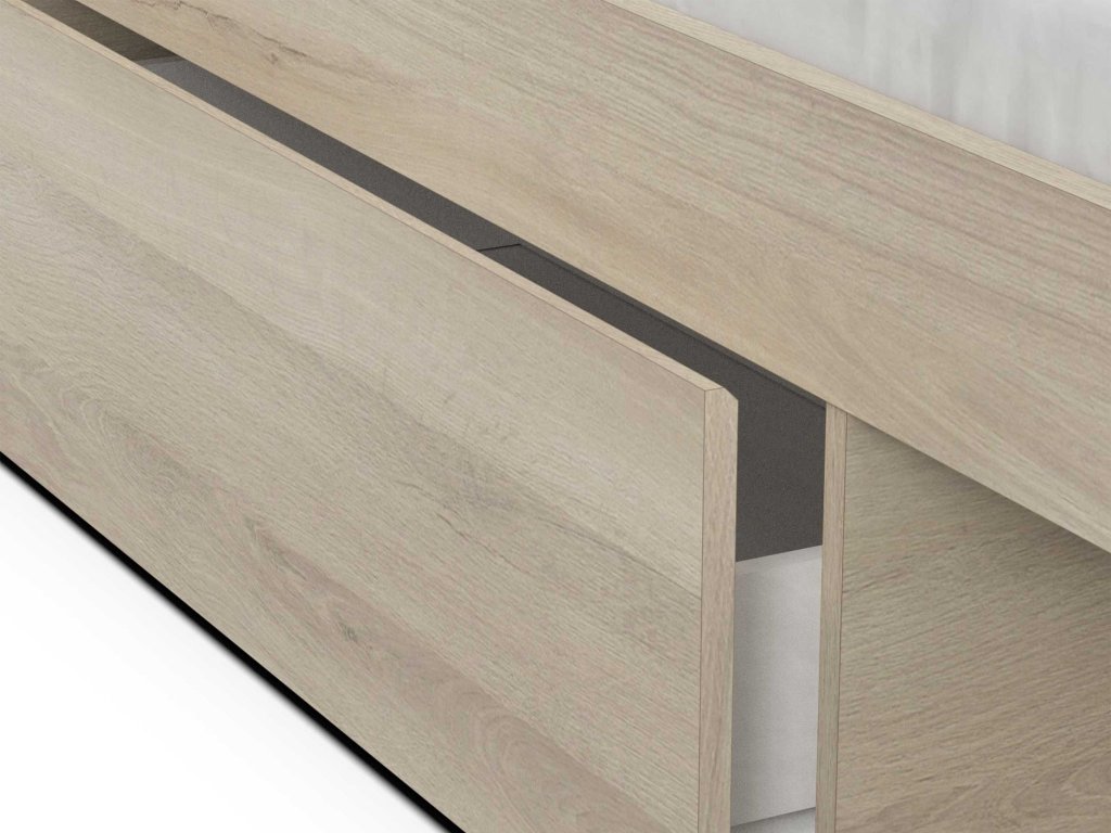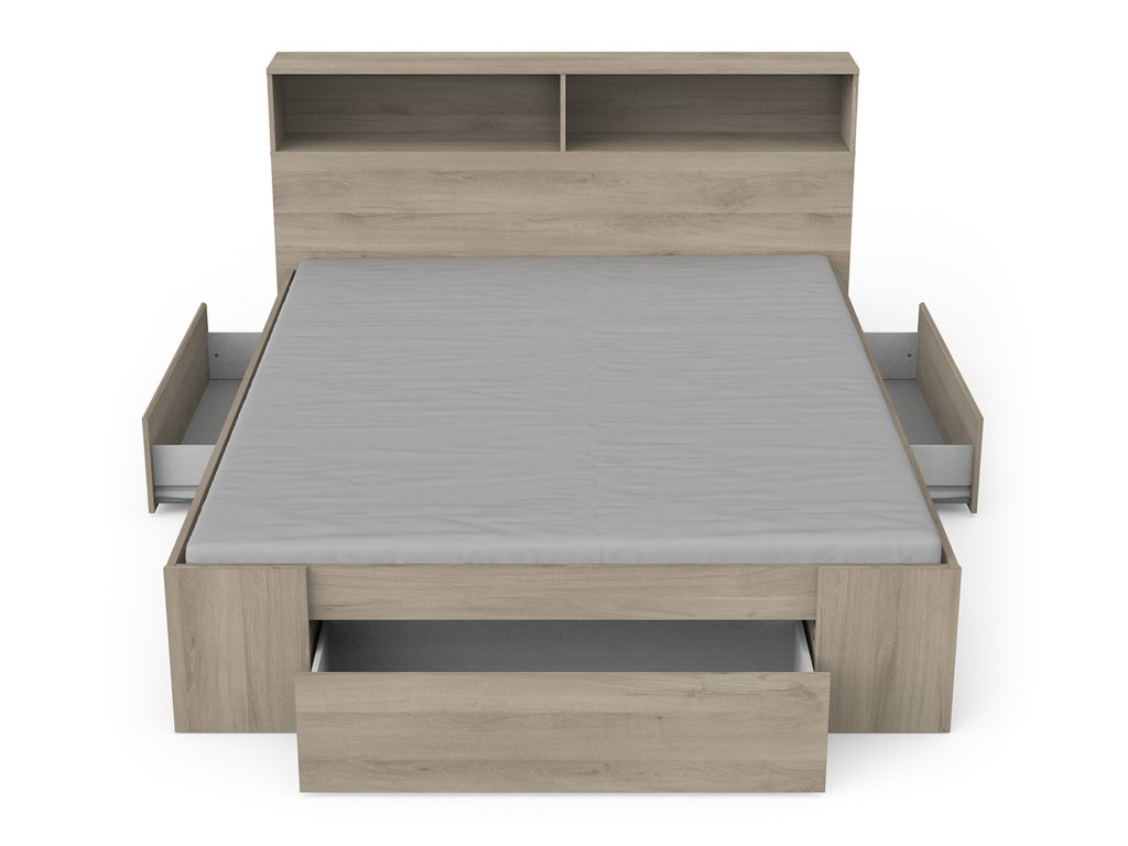 A MAXIMAX franciaágy letisztult, minimalista stílusával és világos Kronberg tölgy színével hívja fel magára a figyelmet, amely modern hangulatot visz a hálószobába. Az ágy kiváló minőségű melamin bevonatú forgácslapból készült, amely ellenáll a karcolásoknak és nagyon könnyen tisztán tartható. Masszív szerkezetének köszönhetően stabilitást és hosszú élettartamot garantál. A Maximax kétszemélyes ágy nagy előnye, hogy a fekvőfelület alatt három tágas ágyneműtartó tároló fiók található, amelyek ideálisak az ágynemű, a párnák, a paplanok vagy a szezonális ruhák elhelyezésére. Az ágytámlában is négy nyitott beépített rekesz található, amelyek éjjeliszekrényként vagy könyvespolcként is használhatók.