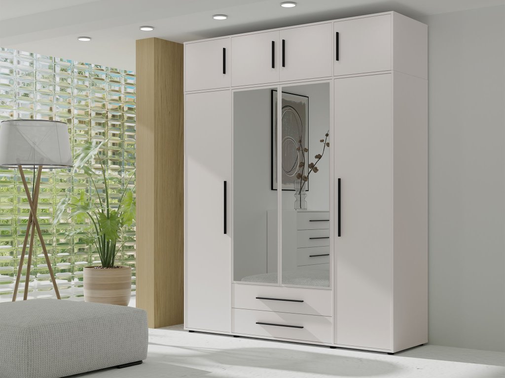 Fehér Maxione kiegészítés stílusos és praktikus kiegészítője a szekrénynek, amely hatékonyan bővíti a tárolóhelyet. A négyajtós kivitel és a 197 cm szélességgel helyet kínál ruhák, ágyneműk vagy szezonális kiegészítők számára, miközben megőrzi a rendezett és modern megjelenést a helyiségben.