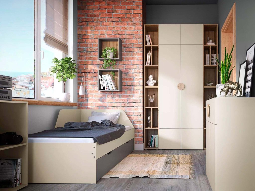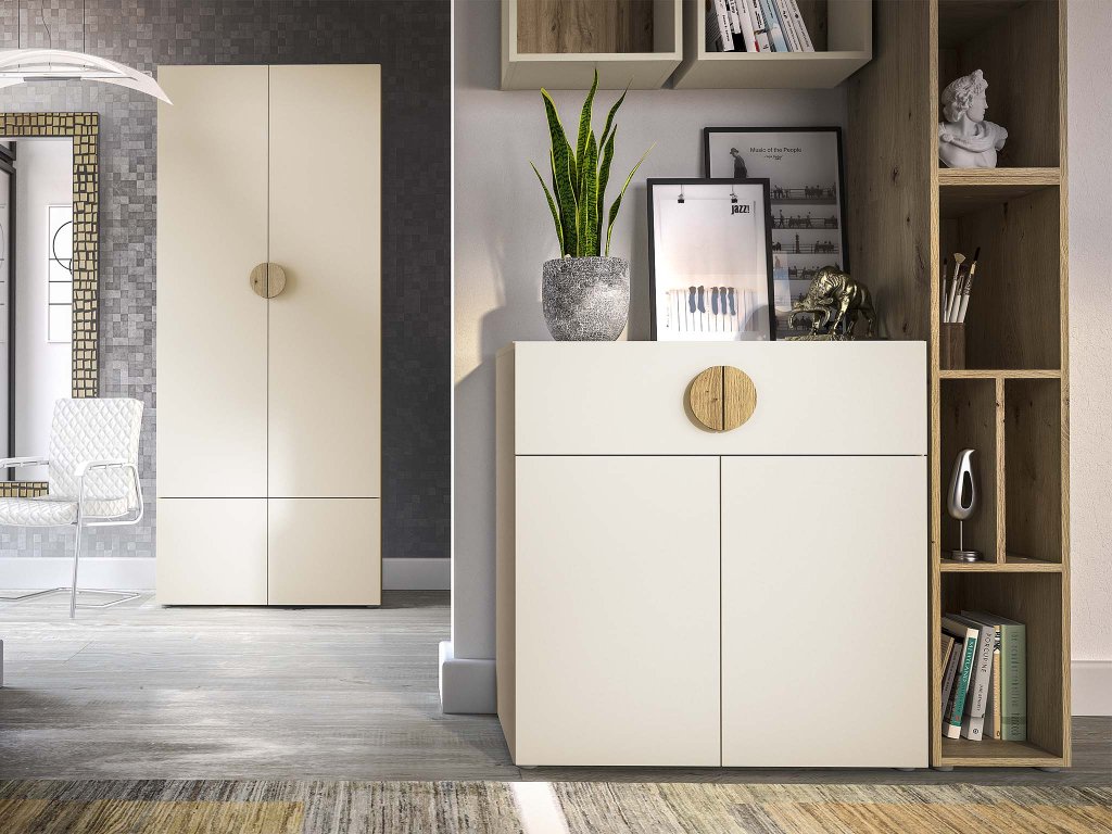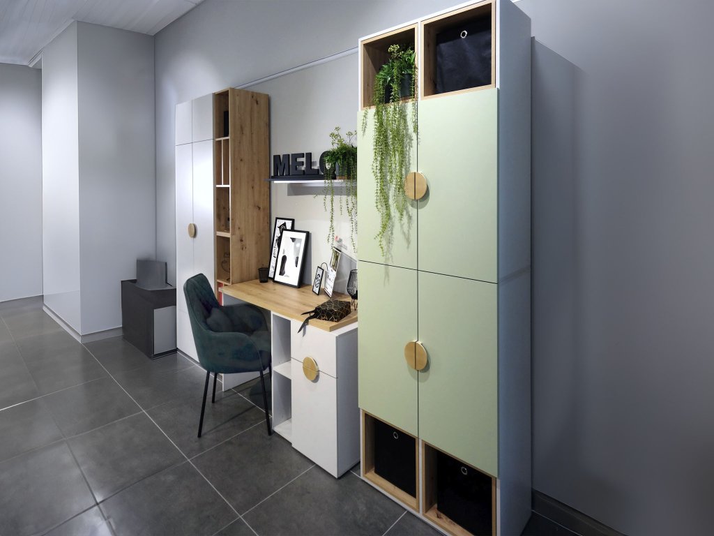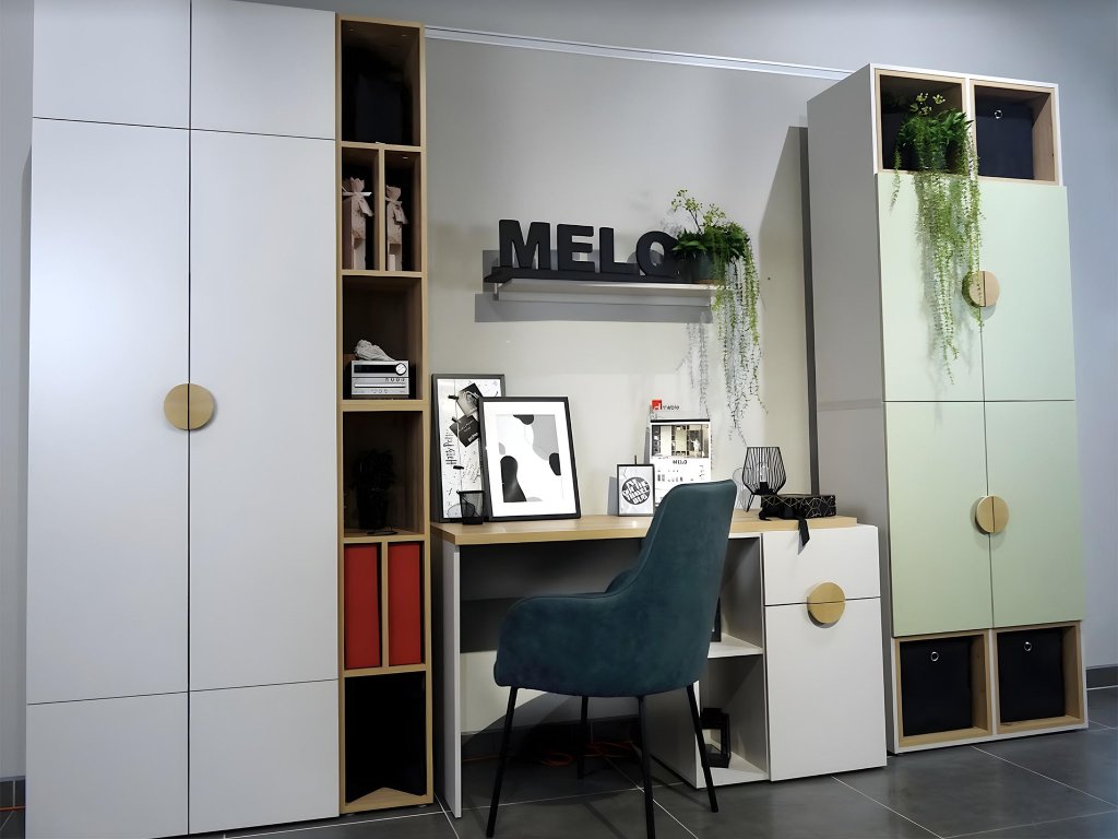 A modern MELO kollekció stílust visz minden gyerekszobába, ifjúsági szobába vagy dolgozószobába. Az egész bútor családot úgy tervezték meg, hogy elegáns és praktikus bútorok alkossák. A gyönyörű bútor szett krémszínben készül tölgy elemekkel kombinálva, amely igazán lágy, kellemes és otthonos hangulatot teremt. A bútorok minőségi laminált bútorlapból készülnek ABS élzárással, melynek köszönhetően biztosítva van a hosszú élettartama és ellenálló lesz a karcolásokkal szemben is. Az egyes darabok artisan tölgy színben készült kerek fogantyúkkal rendelkeznek. Az egyes bútordarabokat saját kedve és ízlése szerint kombinálhatja, így hozva létre egy saját bútor összeállítást.