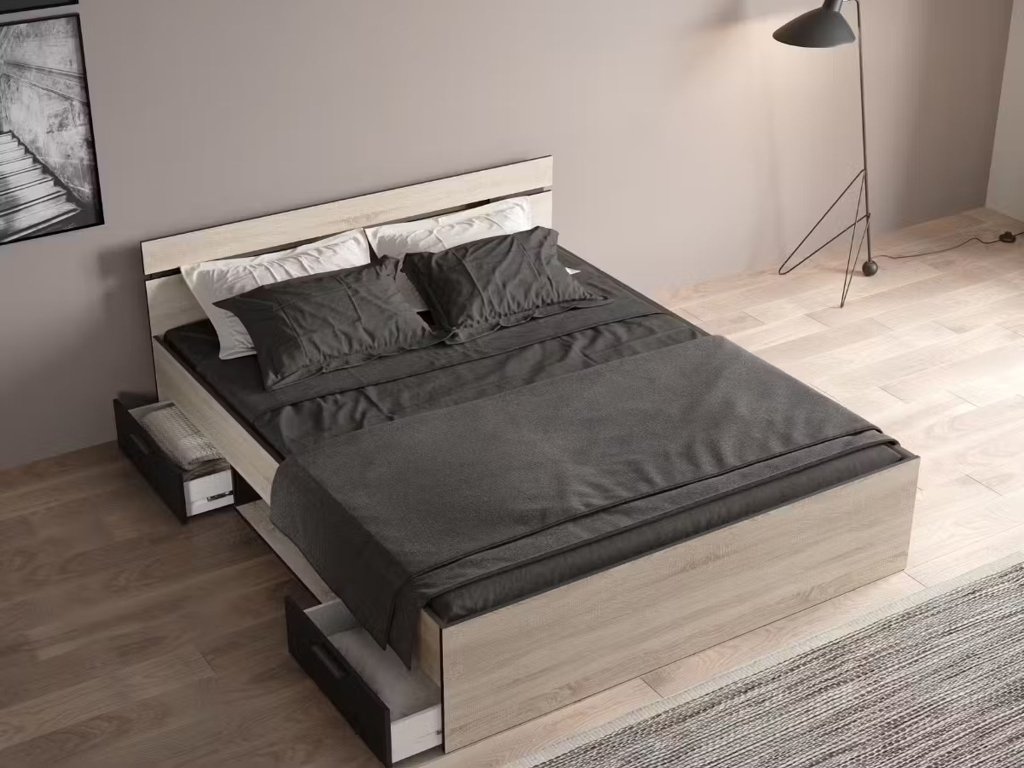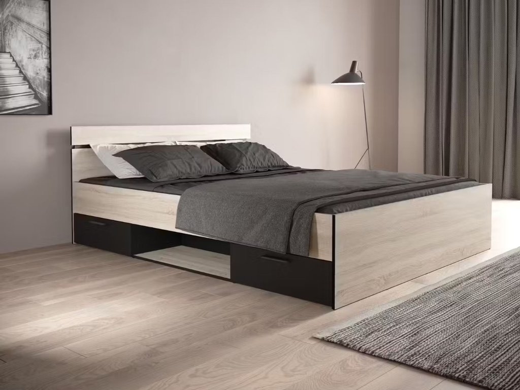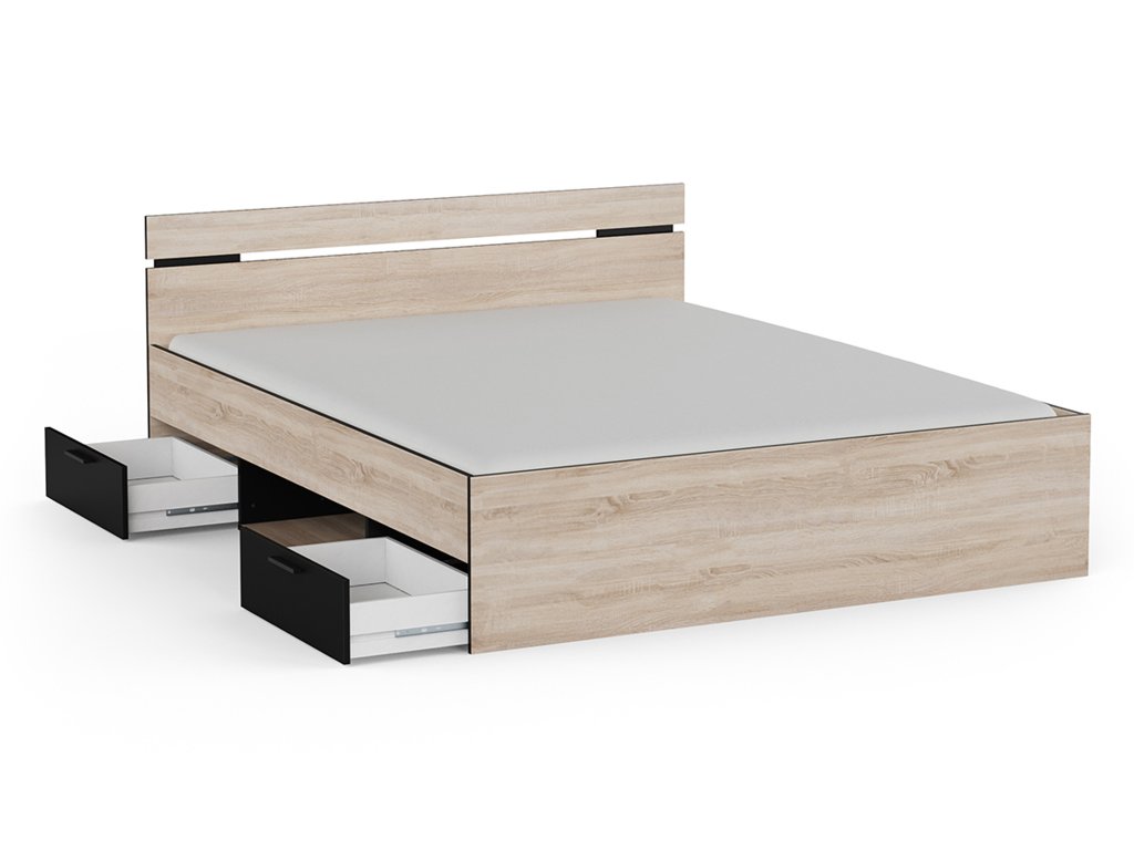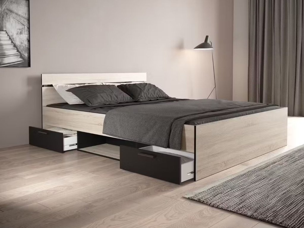 MICHIGAN franciaágy 160x200 cm tölgy színben kontrasztos fekete elemekkel, amelyek együtt stílusos és modern hatást keltenek. Méretének hála nem csak a hálószobába, de az ifjúsági szobába is megfelelő. A két tágas ágyneműtartó tároló fiók helyet biztosít az ágyneműnek vagy a párnáknak, plédeknek. Ez a két tároló fiók ráadásul az ágy jobb vagy bal oldalába is felszerelhető az Ön igényeinek megfelelően.