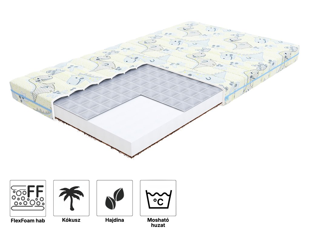 Anyagösszetétel: steppelt huzat, FlexFoam hab, jól szellőző kókusz réteg, hajdina
