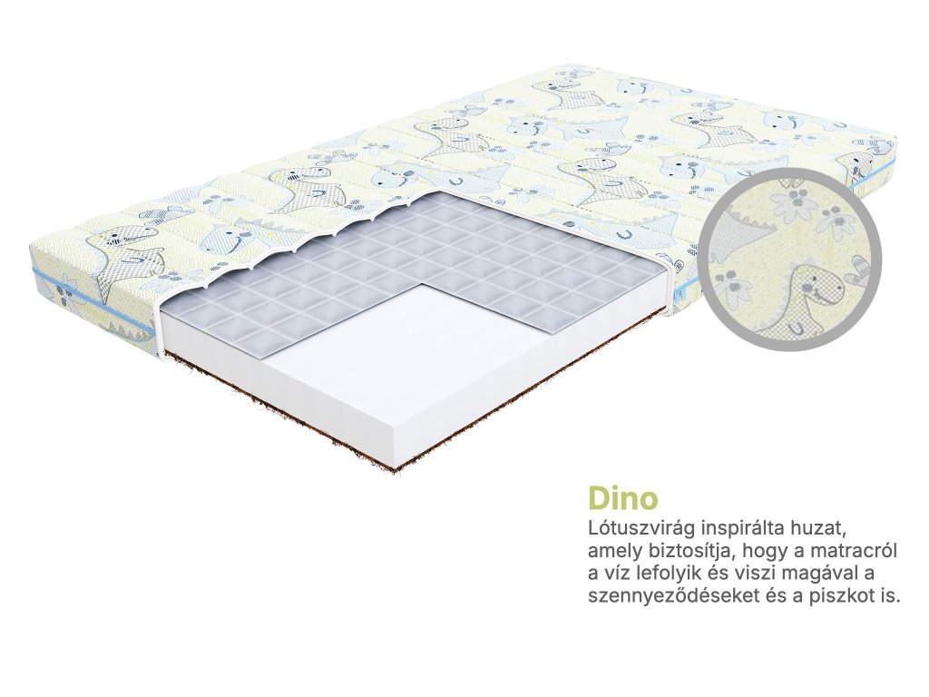 Speciális MIDINO 120x60 cm babamatrac a kiságyba. A matrac magját FlexFoam poliuretán hab alkotja. Ez az anyag nem deformálódik, melynek köszönhetően a matrac kényelmes marad és biztosítja gyermeke kényelmét alvás során. A minőségi hab megfelelő alátámasztást nyújt a hátgerincnek. A kókuszréteg igazán jó tulajdonságokkal rendelkezik, védi a matracot a baktériumok elszaporodásától, ráadásul antiallergén tulajdonságokkal is rendelkezik. A kókusz rostok nagyon könnyűek, légáteresztőek, rugalmasak, ellenállóak a nedvességgel és a deformációval szemben. A kókusz rostok segítik a matracban a levegő áramlását és megakadályozzák a túlzott izzadást. A matrac cipzáras levehető DINO huzattal rendelkezik, amely egy különleges anyagból készült, melynek köszönhetően ellenálló a szennyeződésekkel szemben. A természet inspirálta, pontosabban mondva a lótusz virág. Amikor esik az esőcseppek leperegnek a lótusz szirmairól és magukkal viszik a különböző szennyeződéseket, miközben a lótusz tiszta és száraz marad. A víz lefolyik a matracról és nem hagy rajta foltot. A jól szellőző huzat védi a matracot a szennyeződésektől és a penésztől. A huzat anyagának mikroszkopikus háromdimenziós szerkezete van. A hajdina réteg természetes hajdina magok héjából készül, melyek párnás zónákba vannak bevarrva. Ez a réteg megakadályozza a gerincproblémák kialakulását és segíti a meglévők gyógyulását. A hajdina héjában található tanninok megakadályozzák az atkák elszaporodását.