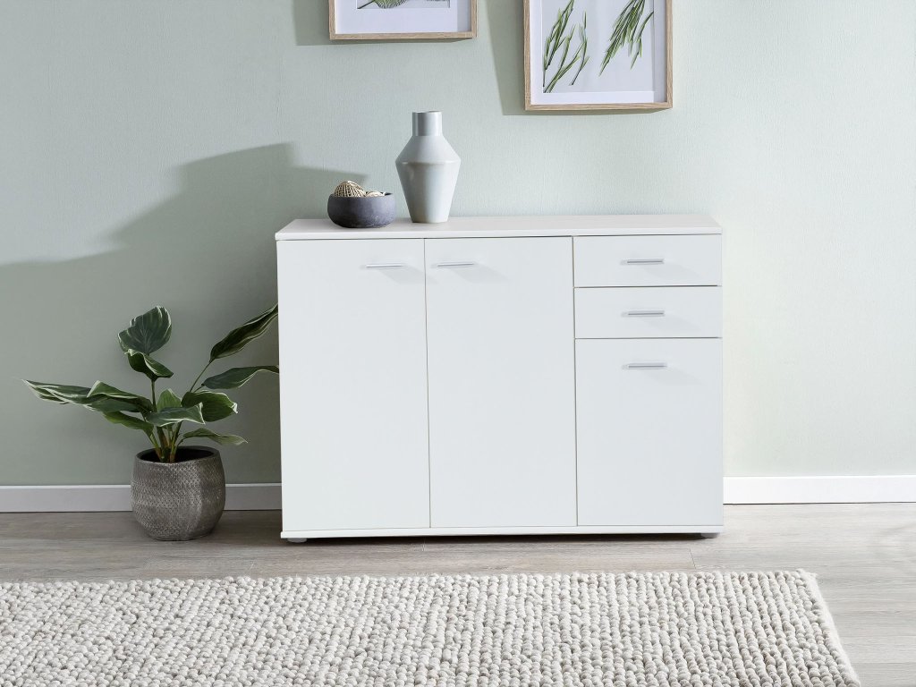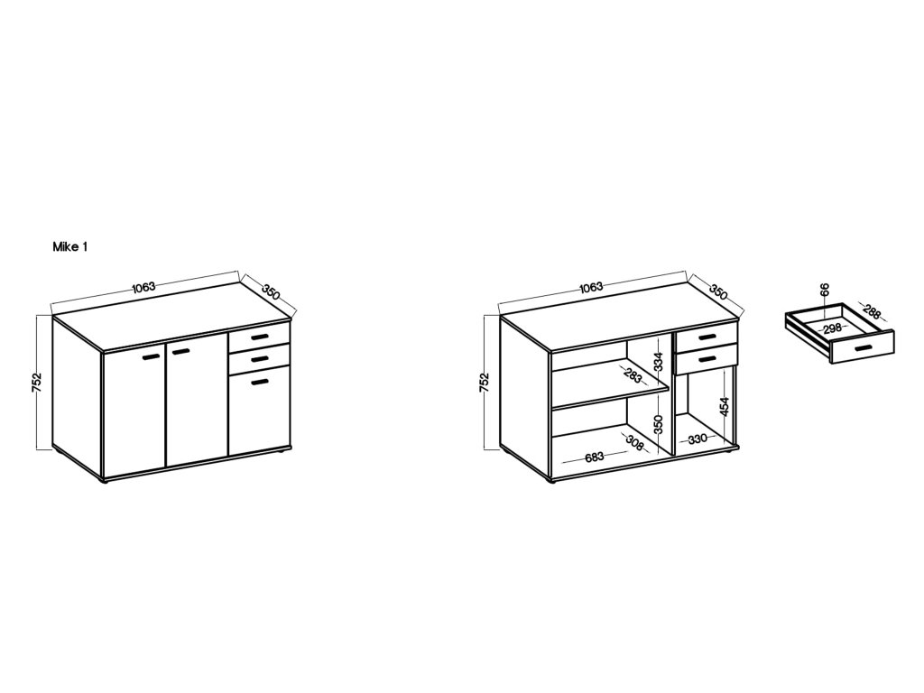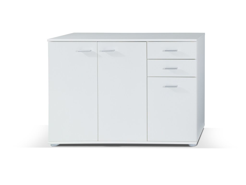 Ha tágas komódot keres otthonába, a Mike 1 a megfelelő választás. Nemcsak nagy tárolóhelyet biztosít, hanem időtlen dizájnjának köszönhetően tökéletesen illeszkedik minden enteriőrbe. A nappali komód minőségi laminált lapból készült, fehér ajtóit szürke fogantyúk egészítik ki. A komód 2 fiókot és polcokat kínál az ajtók mögött. Mindezeket felhasználhatja ruhák és sok egyéb tárgy tárolására. A bal oldalon vízszintesen elhelyezett polc található. A fehér komód alacsony lábakon áll. A komódhoz könnyen illeszthet ruhásszekrényt. Kombinálhatja a Mike 2 vagy Mike 3 komóddal is.