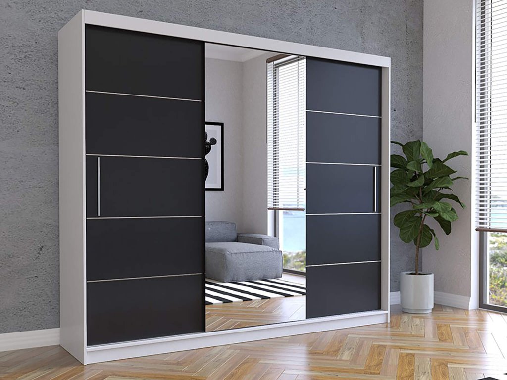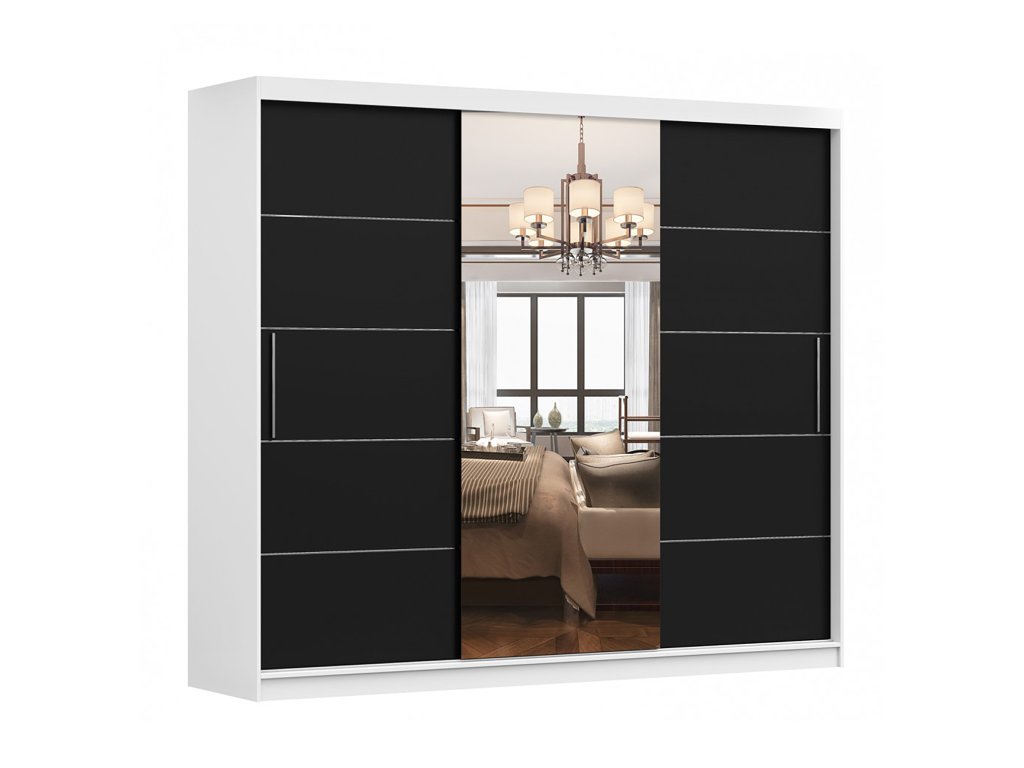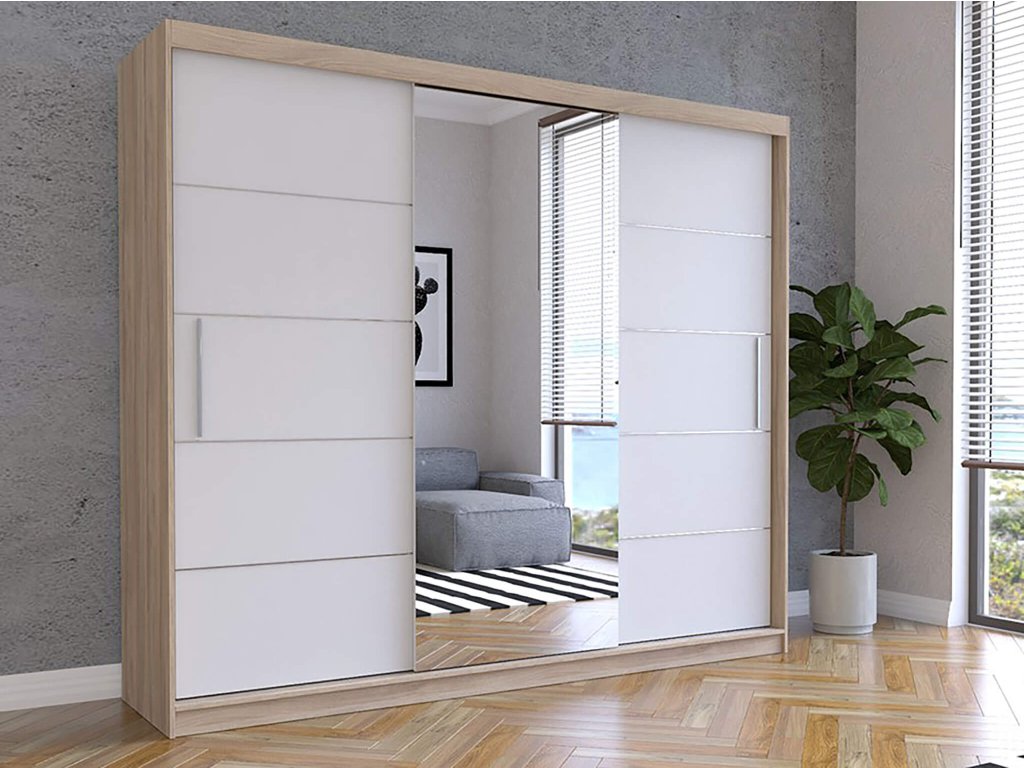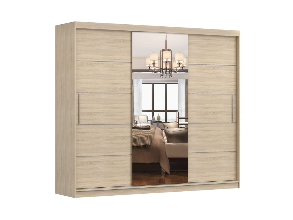 Praktikus és tágas tükrös MILANA gardróbszekrény, amely kombinálja a modern dizájnt a praktikummal, így még a legigényesebb vásárlóik igényeit is teljesíti. A ruhásszekrény szilárd tolóajtós rendszerrel rendelkezik (fém vezetősínek és csapágyas görgők), amelyeknek köszönhetően az ajtó nagyon könnyen mozog. A szekrény PVC fogantyúkkal rendelkezik, amelyek még jobban kiemelik a modernitását. A szekrény ideális választás a hálószobába, előszobába vagy a folyosóra. A szekrény közepén egy akasztórúd található, a két szélében pedig polcok. A bútor minőségi laminált 16 mm vastag bútorlapból készül, a széle ABS élekkel vannak lezárva.
