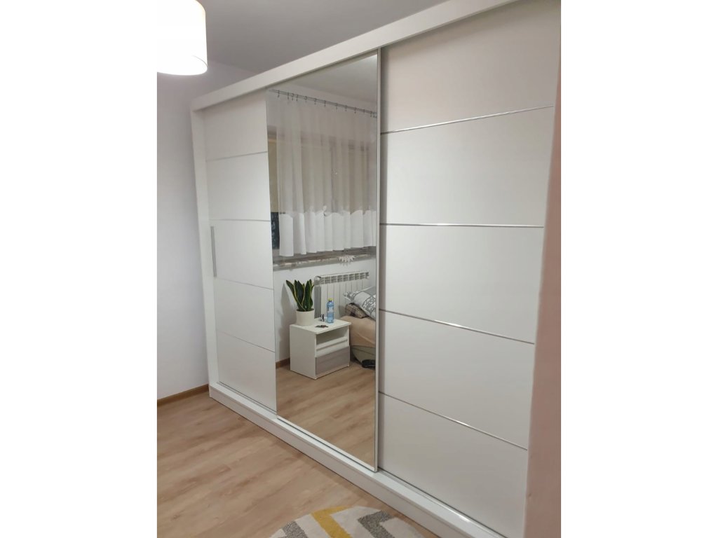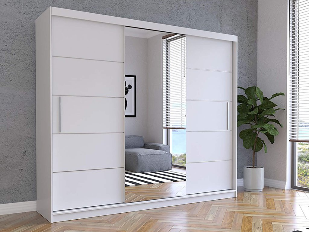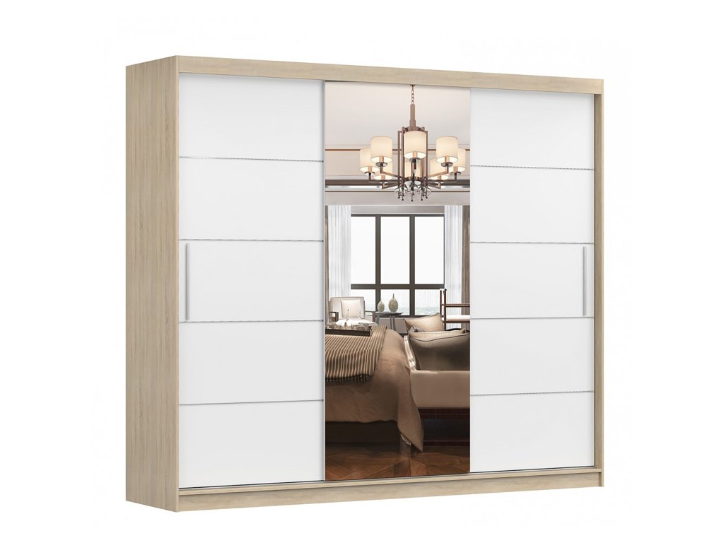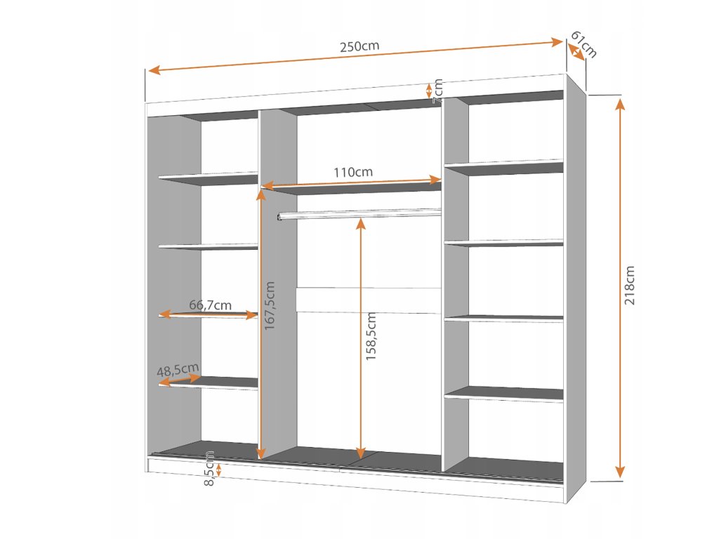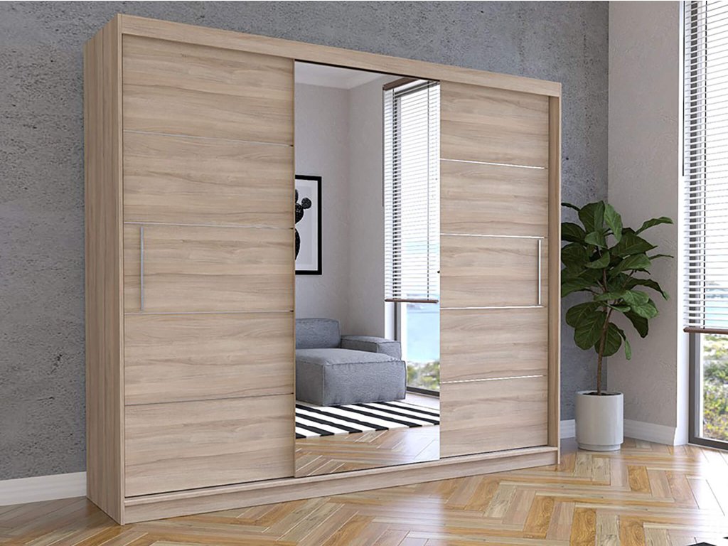 Praktikus és tágas tükrös MILANA gardróbszekrény, amely kombinálja a modern dizájnt a praktikummal, így még a legigényesebb vásárlóik igényeit is teljesíti. A ruhásszekrény szilárd tolóajtós rendszerrel rendelkezik (fém vezetősínek és csapágyas görgők), amelyeknek köszönhetően az ajtó nagyon könnyen mozog. A szekrény PVC fogantyúkkal rendelkezik, amelyek még jobban kiemelik a modernitását. A szekrény ideális választás a hálószobába, előszobába vagy a folyosóra. A szekrény közepén egy akasztórúd található, a két szélében pedig polcok. A bútor minőségi laminált 16 mm vastag bútorlapból készül, a széle ABS élekkel vannak lezárva.