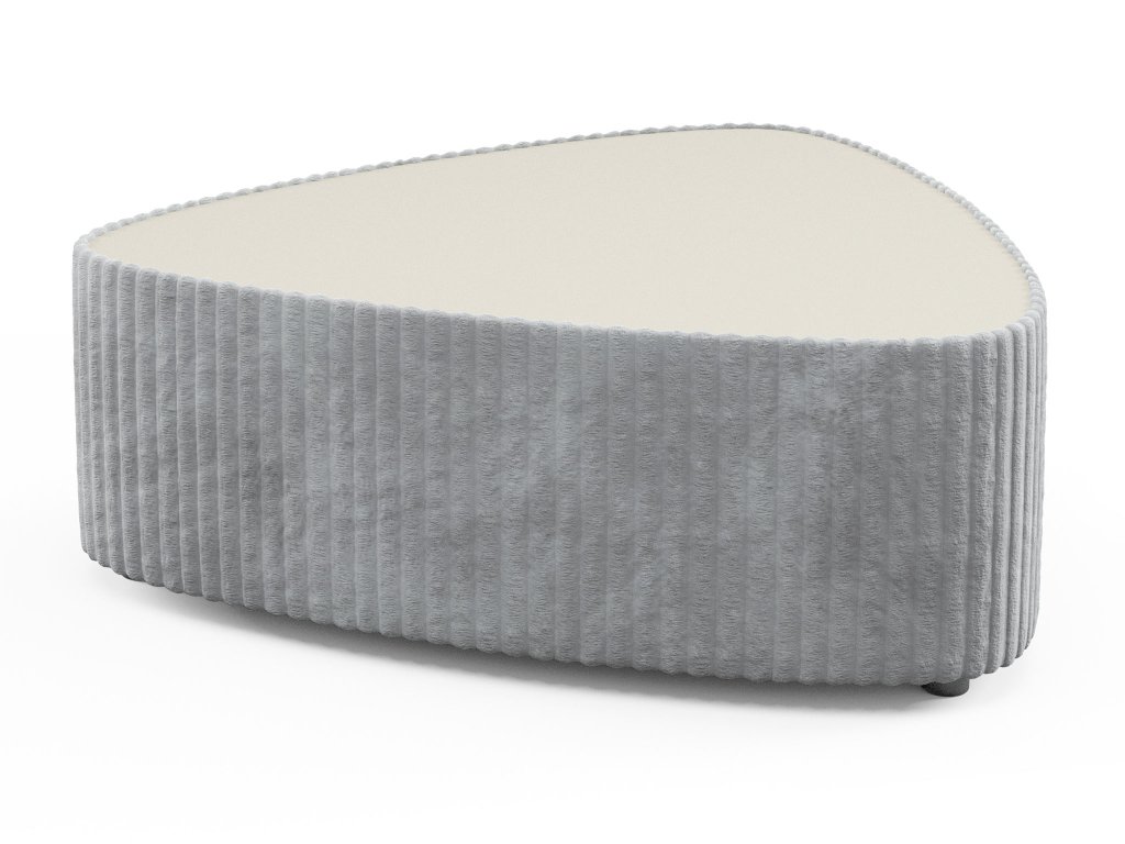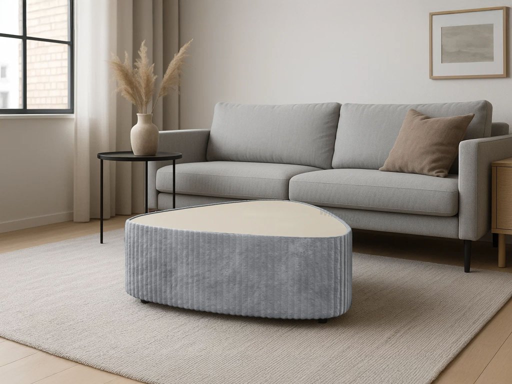 Háromszög alakú MIO dohányzóasztal szürke színű kordbársony szövettel kárpitozva. Az asztallap kiváló minőségű laminált faforgácslapból készült, ami természetes és időtálló megjelenést kölcsönöz a bútornak. Ez a dohányzóasztal nemcsak gyönyörű, de praktikus is. Fekete műanyag lábai biztosítják a stabilitását és a bútor modern jellegét.