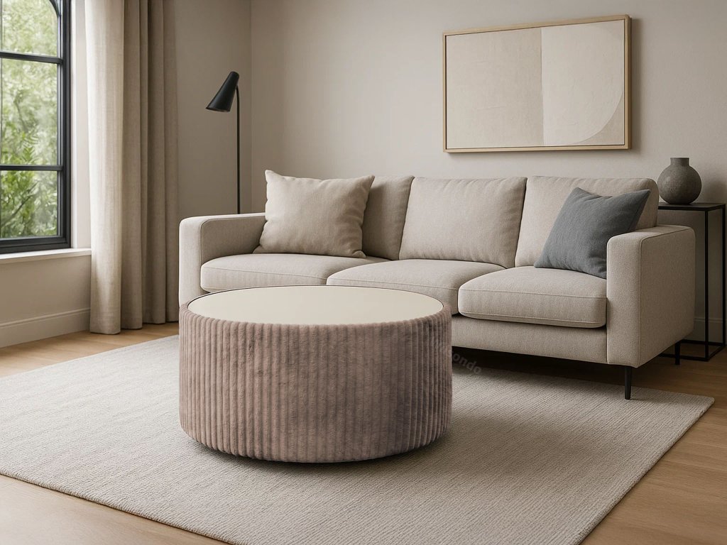 MIO krémszínű kordbársony szövettel kárpitozott minőségi és elegáns kerek dohányzóasztal